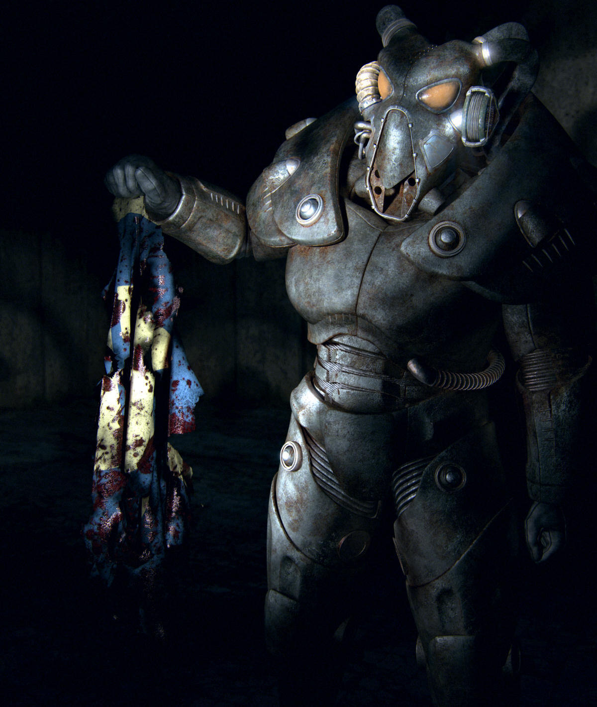 После недолгих поисков на Nexus Mods нашлась моделька классической брони Анклава из Fallout 2 для Fallout 3 (её, видимо, сделал такой же недовольный новым дизайном брони олд, как и я. Спасибо ему). Было решено клеить именно её, просто надеясь, что потом удастся в это влезть (спойлер: получилось почти хорошо).