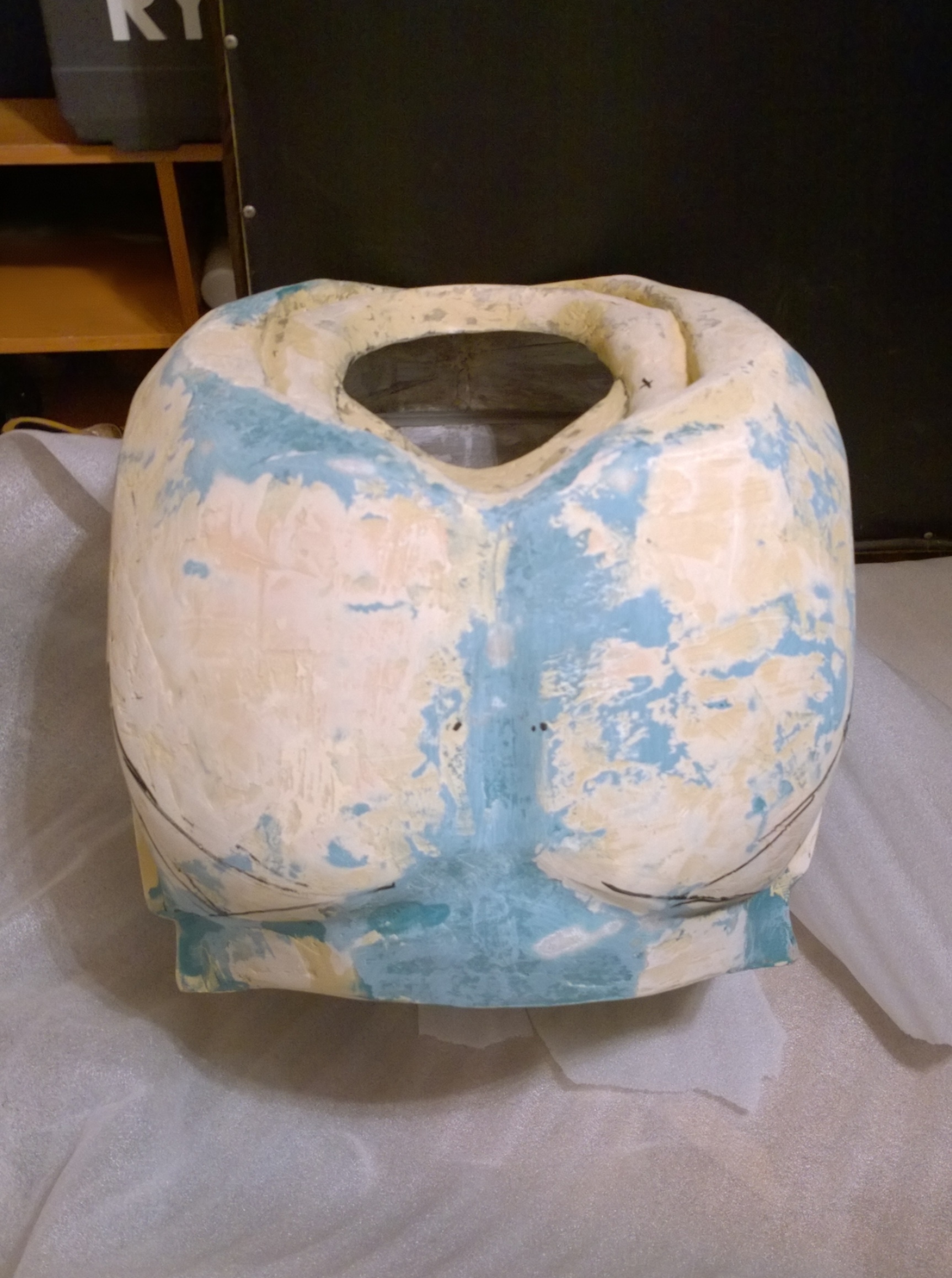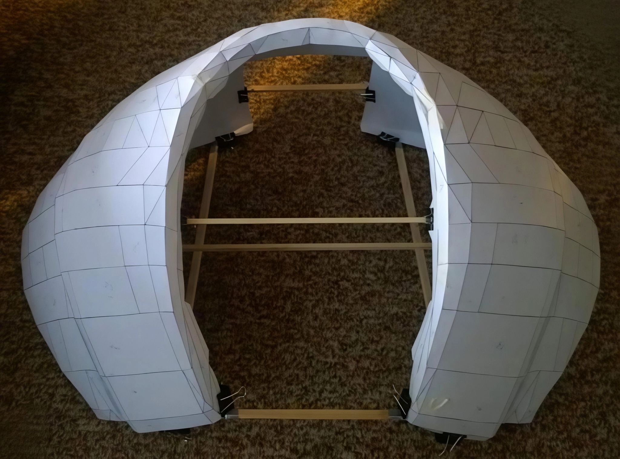 Первый шлем решили клеить из обычной офисной бумаги и укрепить монтажным скотчем — просто чтобы подобрать размер всего комплекта. Размер удалось угадать со второго раза, хотя уже здесь вскрылась первая проблема: шлем нельзя было надеть на голову из‑за очень узкой горловины. Тогда решили, что это проблема будущих нас, и просто продолжили работу. Вообще, те, кто рисовал этот шлем, вряд ли задумывались о том, как он должен сидеть на голове. Разрезав бумагу, шлем удалось примерить, и, на удивление, всё было приемлемо, глаза оказались примерно напротив глазниц и через них даже было что‑то видно.