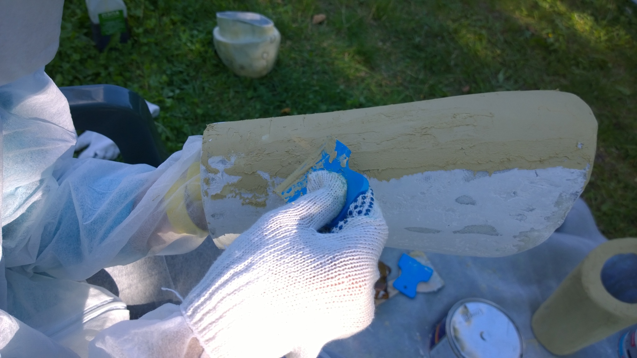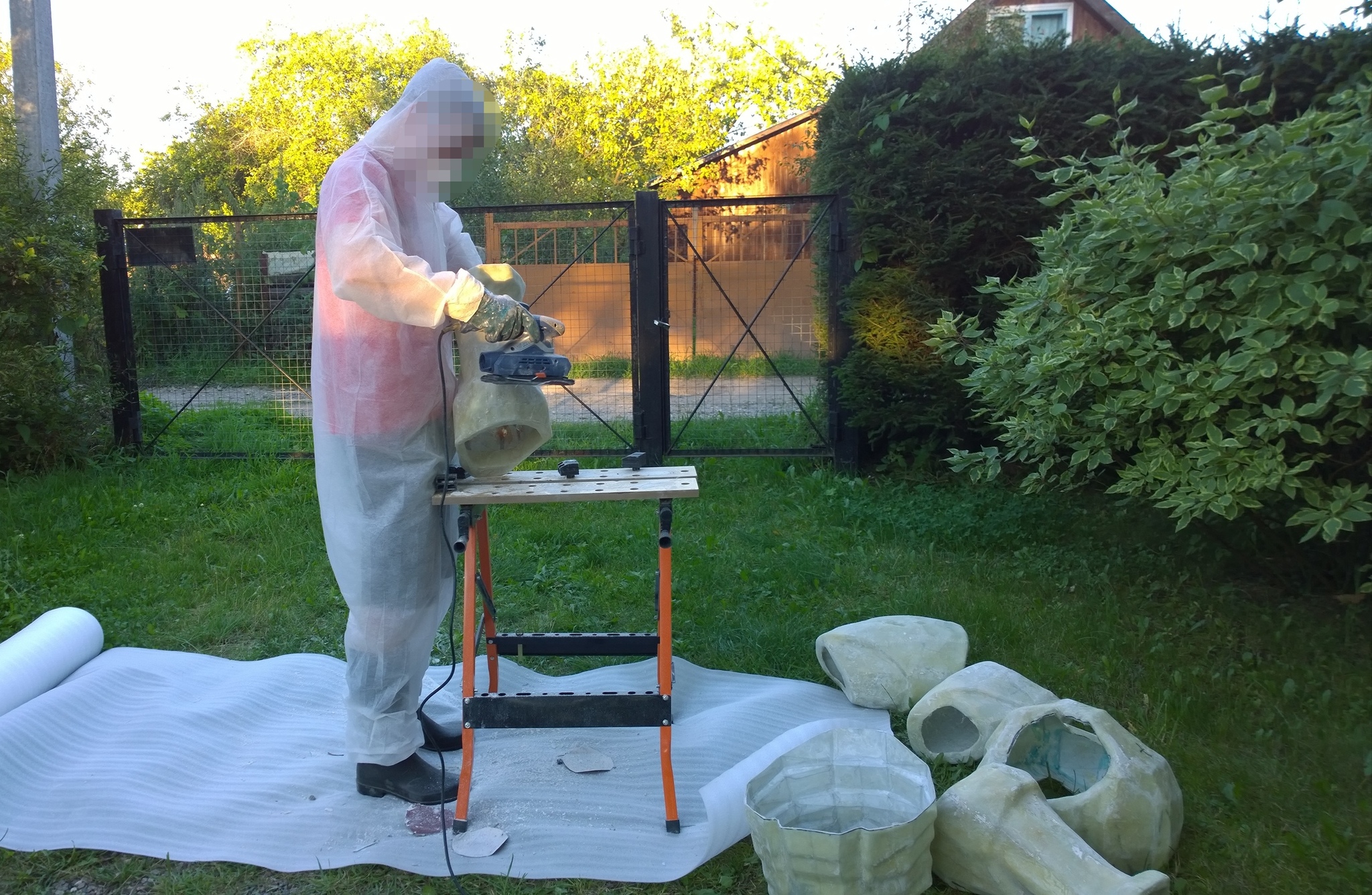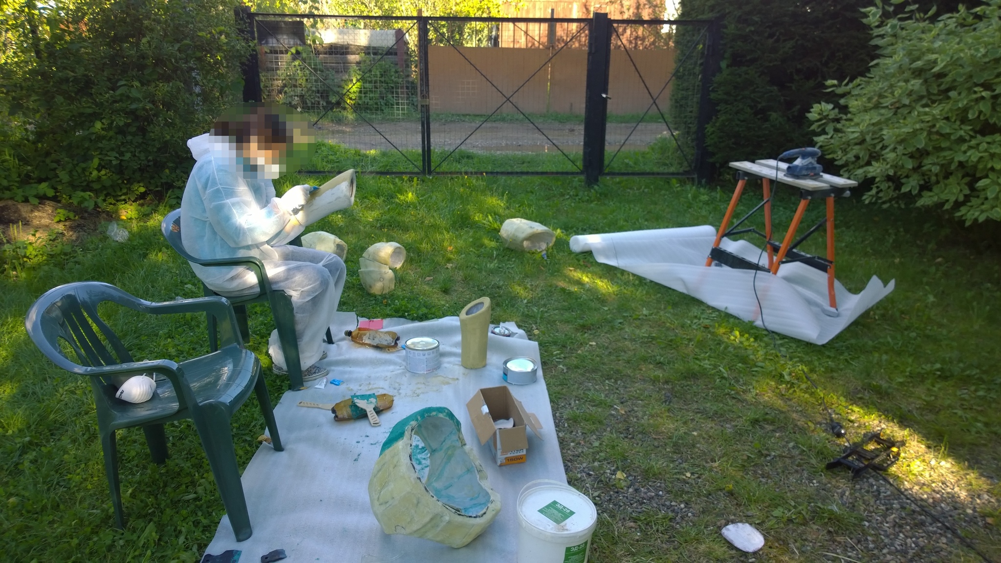 Работы со стеклотканью, шпаклёвкой и шлифовкой старались делать на улице. Шпаклёвку использовали автомобильную со стекловолокном (н‑надёжность!).