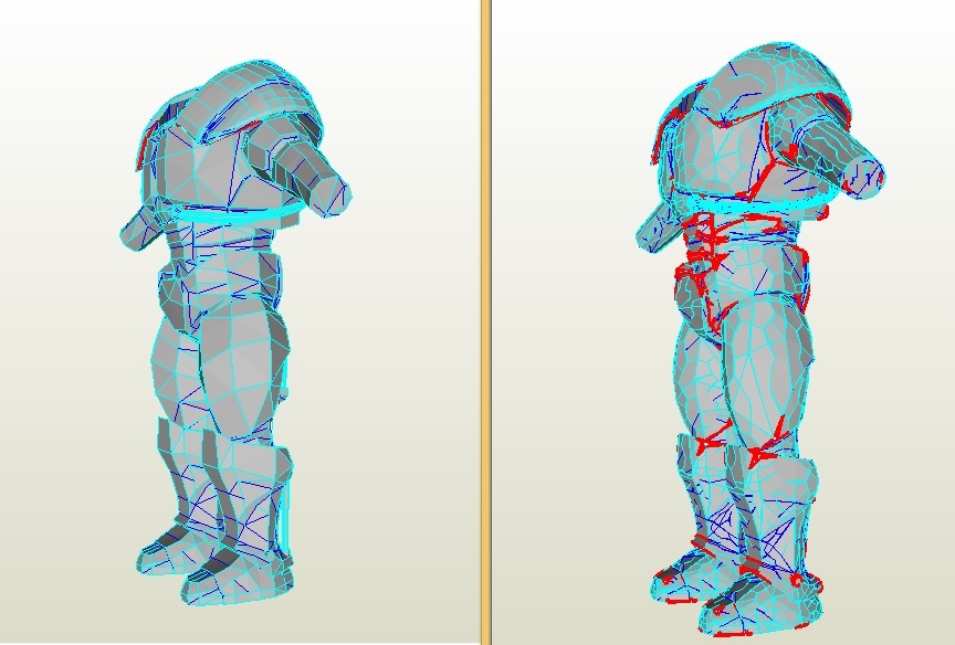 Опыт в 3D‑моделировании на тот момент у меня ограничивался тем, что однажды я несколько часов безуспешно пытался смоделить сиську в Blender, поэтому всё, на что реально хватило скиллов — это нажать «сгладить» в какой‑то программе для 3D‑моделирования. В результате модель «порвалась», образовались отверстия (красные линии на картинке ниже), но выглядело всё при этом куда лучше.