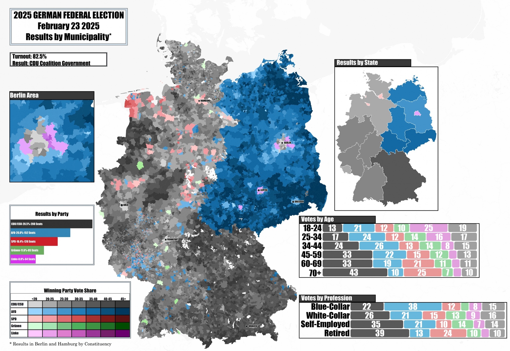 Федеральные выборы муниципалитетов Германии 2025 года. Разногласия между Востоком и Западом очевидны: крайне правая партия «Альтернатива для Германии» (АФД) доминирует в бывшей Восточной Германии, а правоцентристский Христианско-демократический союз (ХДС) победил по всей стране.