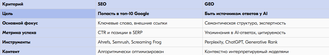 Вместо ключевых фраз GEO фокусируется на смыслах, контексте и достоверности данных, с которыми работают большие языковые модели (LLM).