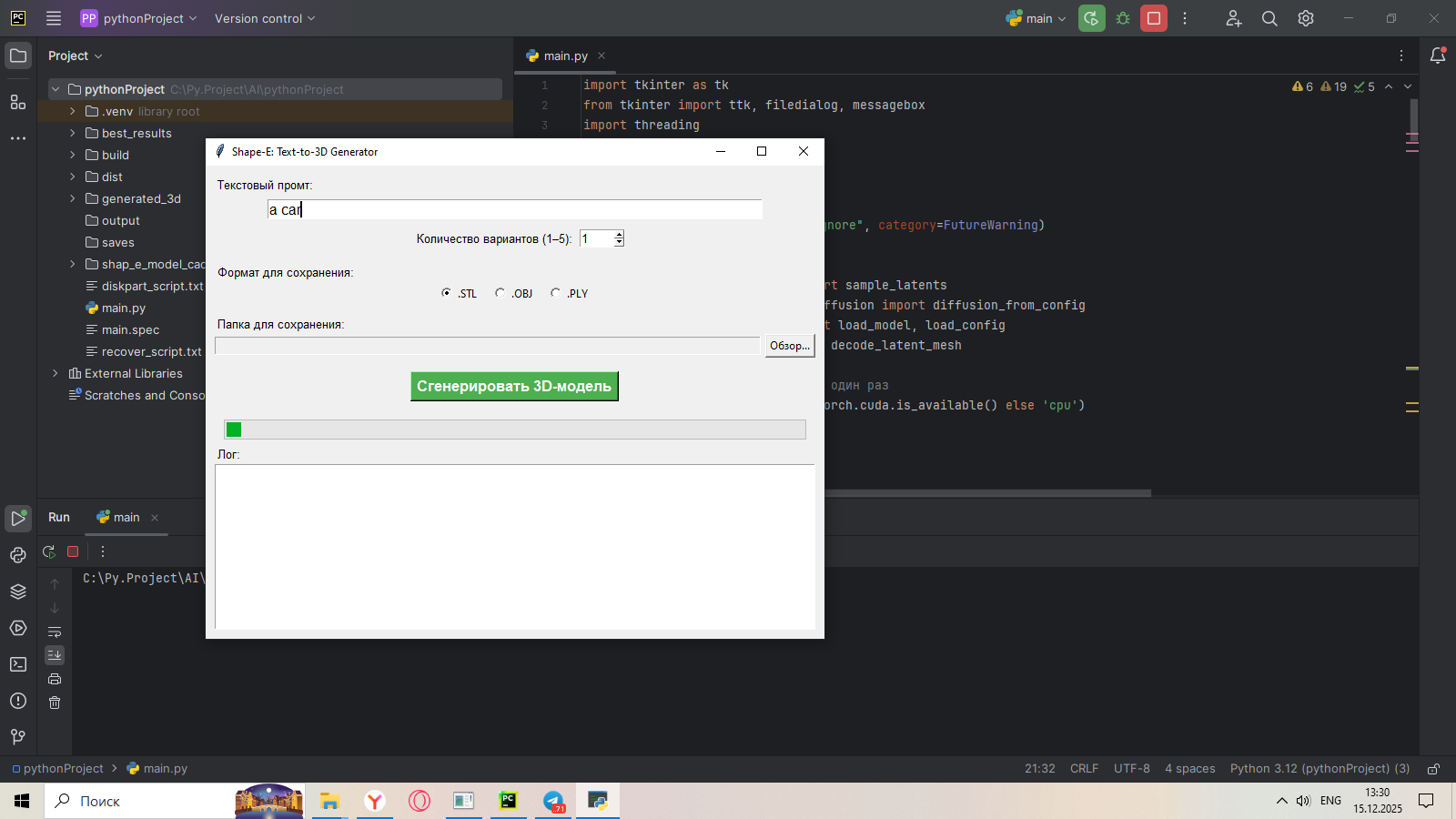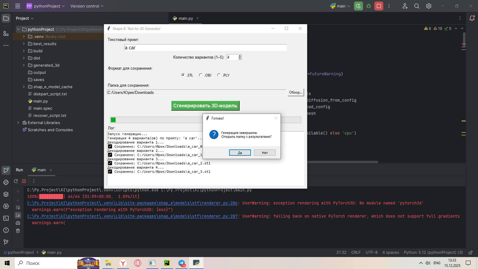 Процесс генерации. Генерация производилась на видеокарте Nvidia 3060 12Gb, довольно шустро не более 5 минут на 4 варианта модели.