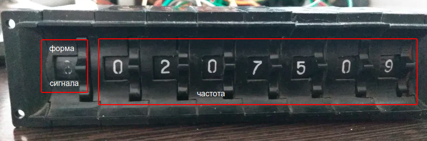Форма сигнала (синус, меандр, треугольник) задается крайним слева переключателем. Генератор фактически может выдавать частоту до 12,5 МГц, на что рассчитан программный переключатель при использовании всех секций, но чтобы не делать отдельную кнопку для изменения формы сигнала, было принято решение ограничить частоту генератора до 10 МГц и отвести под переключатель формы сигнала одну из секций переключателя.