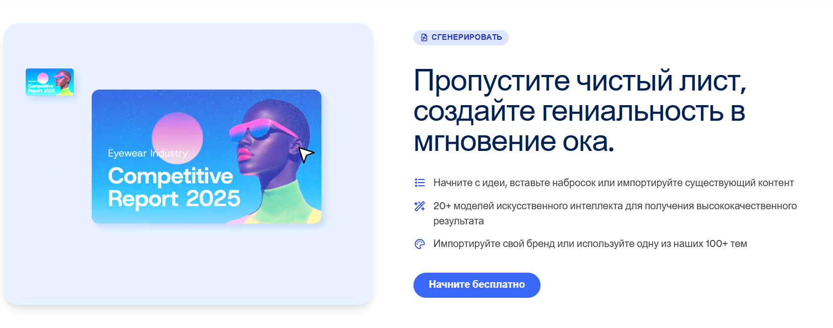 Особенность сервиса — огромная библиотека визуального контента. Более 100 тысяч фотографий, иллюстраций, иконок. ИИ автоматически подбирает изображения под тему и создаёт гармоничную цветовую схему.
