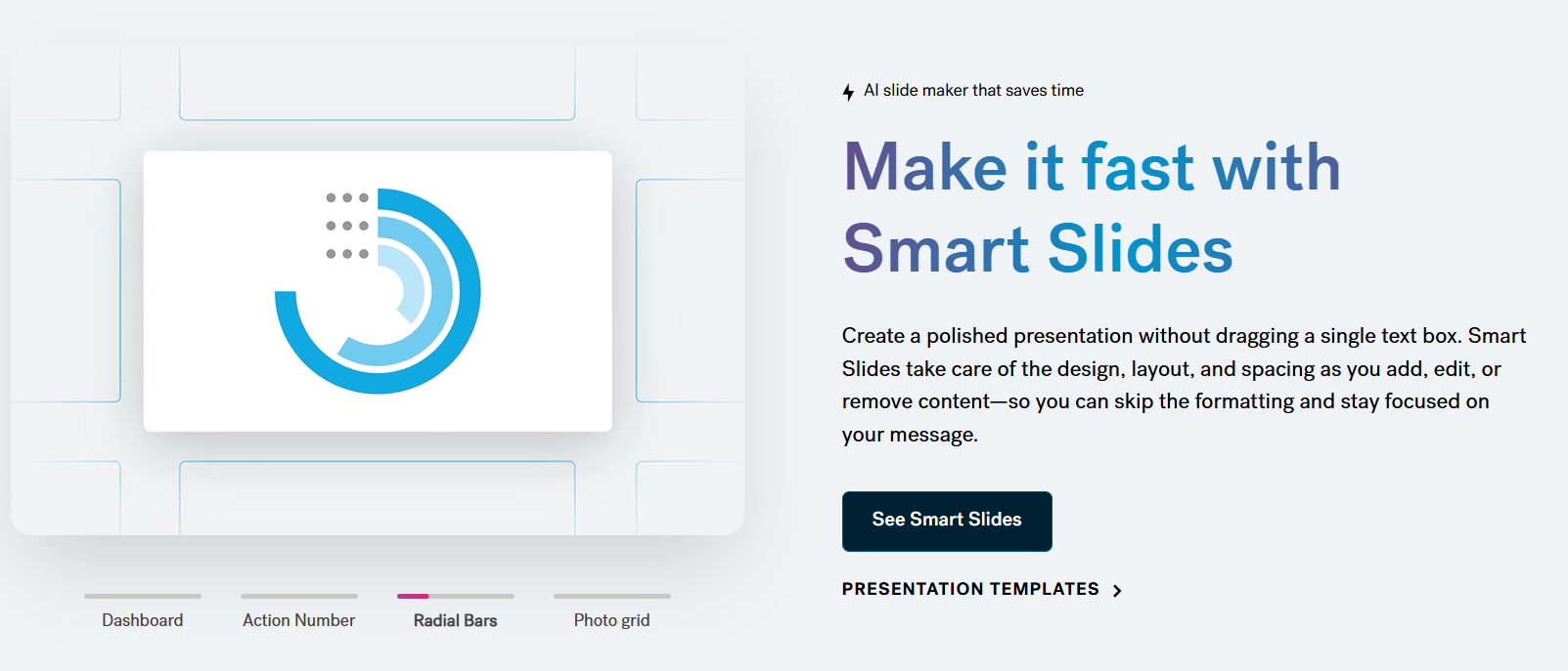 Beautiful AI позиционируется как сервис с самым умным ИИ-дизайнером. Система анализирует контент и автоматически применяет правила типографики, цветовой теории, композиции. Результат — профессионально выглядящие слайды даже у новичков.