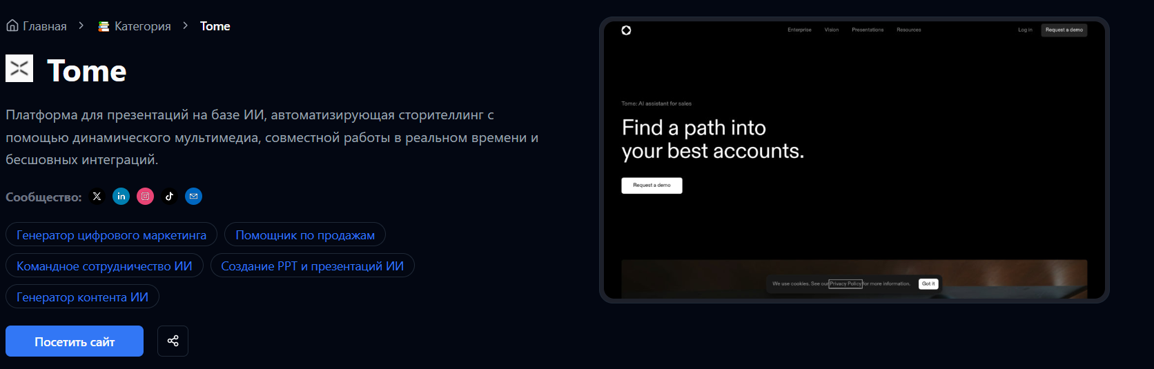 Примечание: сервис Tome AI прекратил работу в конце 2024 года, но его подход к созданию презентаций был настолько инновационным, что стоит упомянуть для понимания развития индустрии.