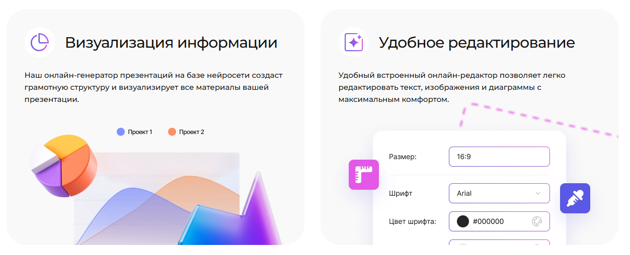 Минусы: бесплатная версия ограничена 10 слайдами; иногда требуется ручная корректировка сгенерированного текста; ограниченный выбор анимаций.