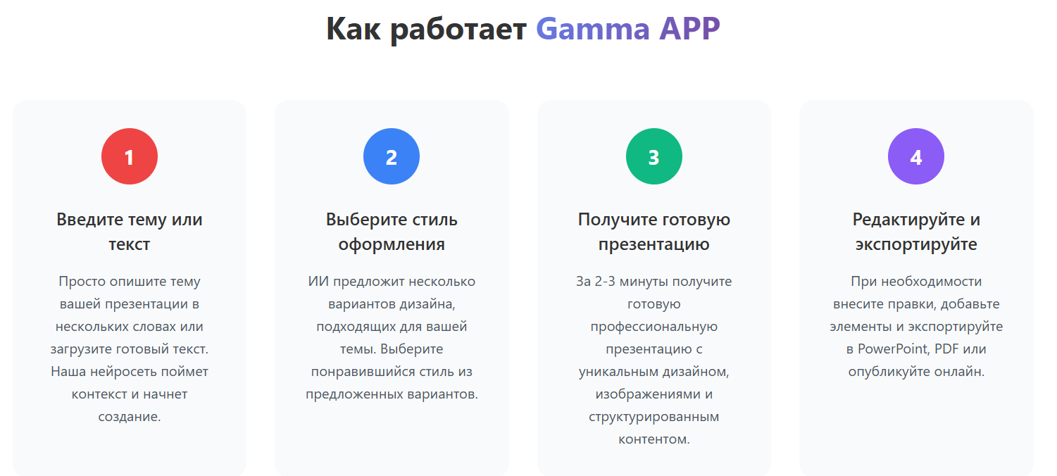 Presentacium показал лучшие результаты в тестировании: быстрая генерация, качественный контент, удобный редактор. Подходит для большинства задач — от студенческих презентаций до корпоративных проектов. Если этот сервис по каким-то причинам не подошёл, Gamma-app.ru станет достойной альтернативой с похожим функционалом.