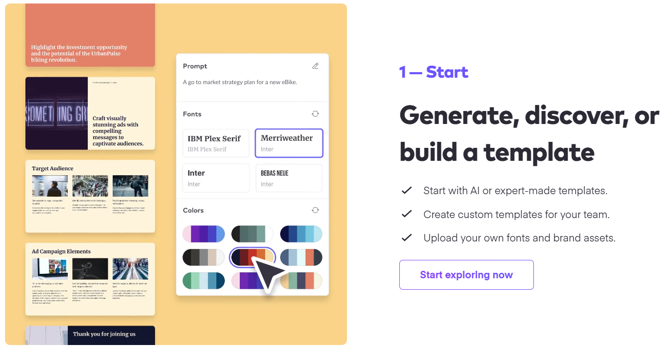 Создаёт презентации двумя способами: по описанию темы и из загруженного текста. Процесс генерации занимает 3-4 минуты. Есть встроенный редактор для последующей доработки слайдов. Особенно хорошо справляется с академическими и образовательными презентациями.