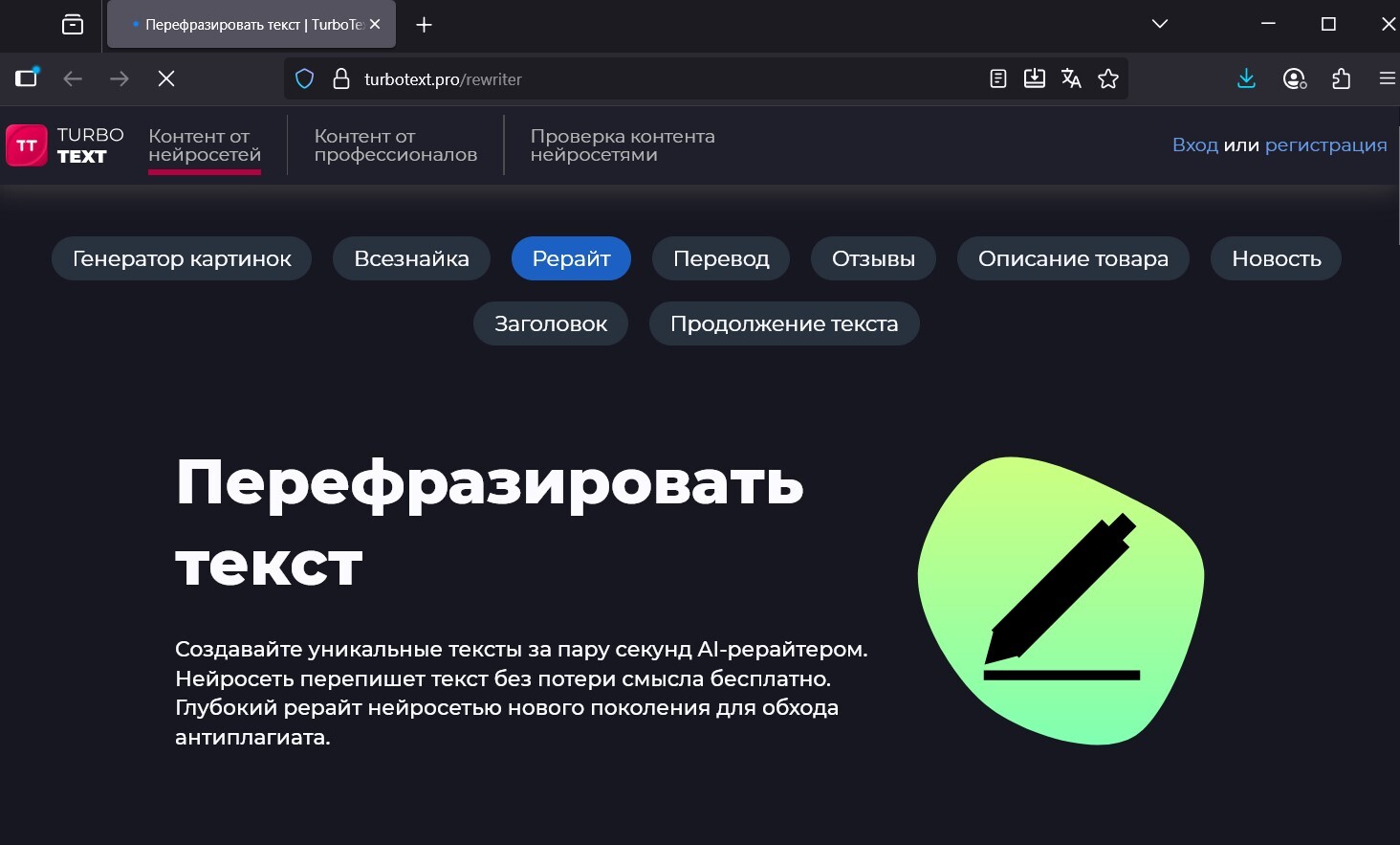 TurboText - ИИ-генератор текста для рерайта, переводов, отзывов и заголовков, доступный через Telegram. Обеспечивает высокую уникальность текстов. В 2025 году добавлена генерация логотипов, что расширяет функционал. Пользователи хвалят скорость работы: текст создается за секунды. Например, для новостных сайтов TurboText генерирует короткие заметки мгновенно.