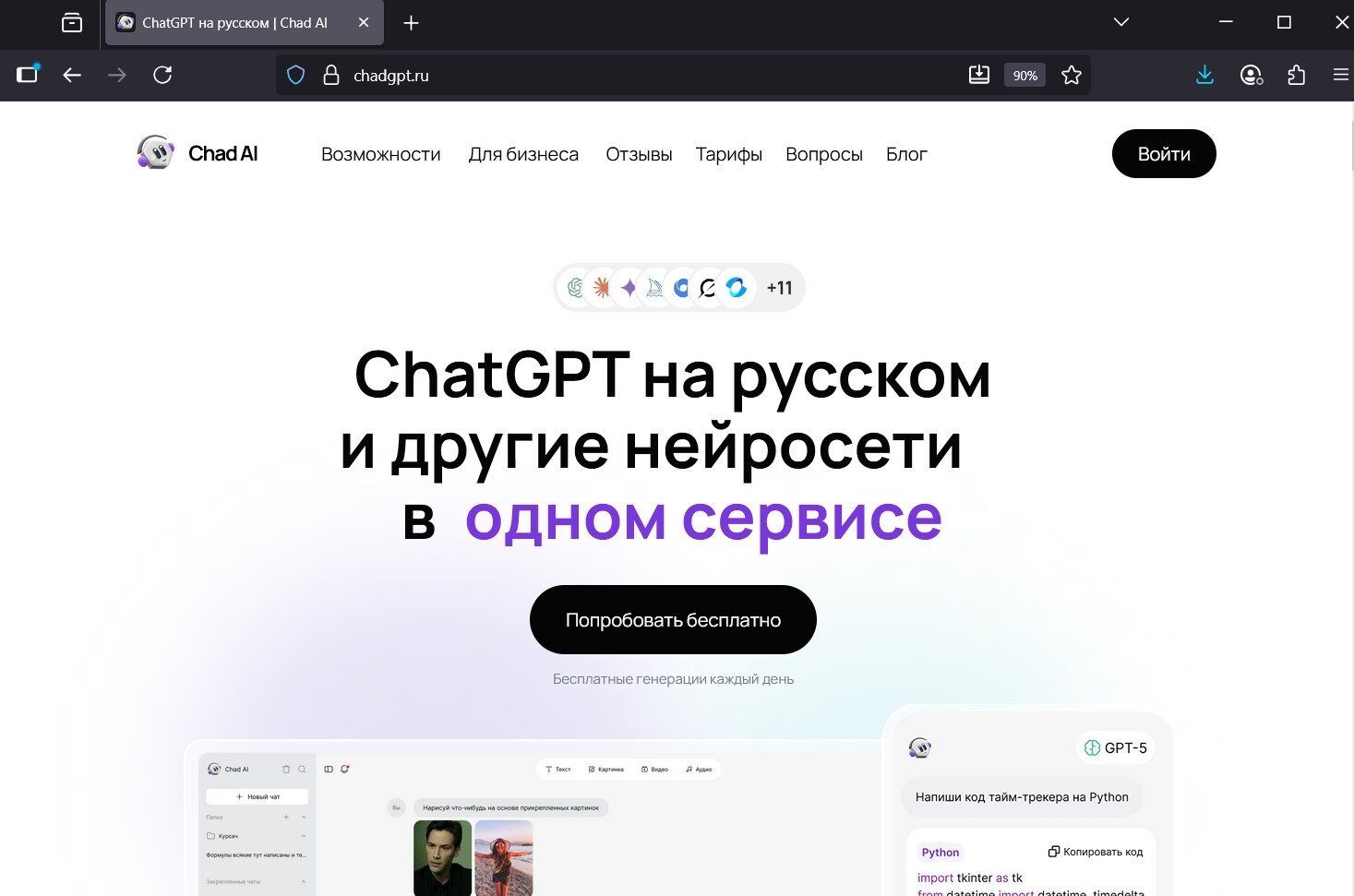 Chad AI - русскоязычная адаптация ChatGPT, выступающая как универсальный генератор текста для статей, рекламы, анализа данных и диалогов. Работает без "запрещенного сервиса на три буквы", с памятью чата и веб-поиском для актуальной информации. В 2025 году интегрировала модели GPT-5 и Claude 4, что позволяет создавать маркетинговый контент, блог-посты и коммерческие предложения. Пользователи хвалят ежедневные бесплатные генерации и мобильные приложения с голосовым режимом.