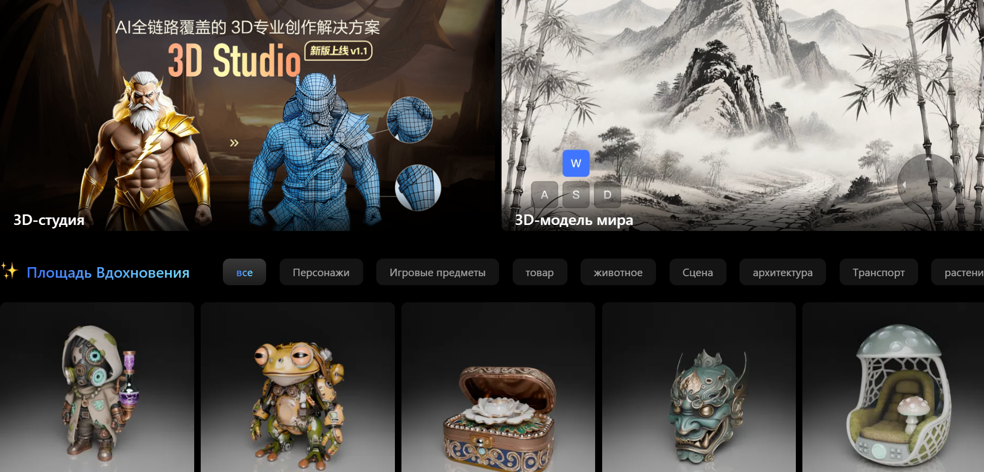 Главная страница предлагает разделы: Text-to-3D (текст в модель с точной геометрией и материалами), Image-to-3D (до 4 фото для высокоточного 3D), Sketch-to-3D (эскиз + цвет/материал в полноценную модель). Есть Texture Generation (PBR-текстуры 4K для своих или сгенерированных меш), 3D Animation (анимация моделей).