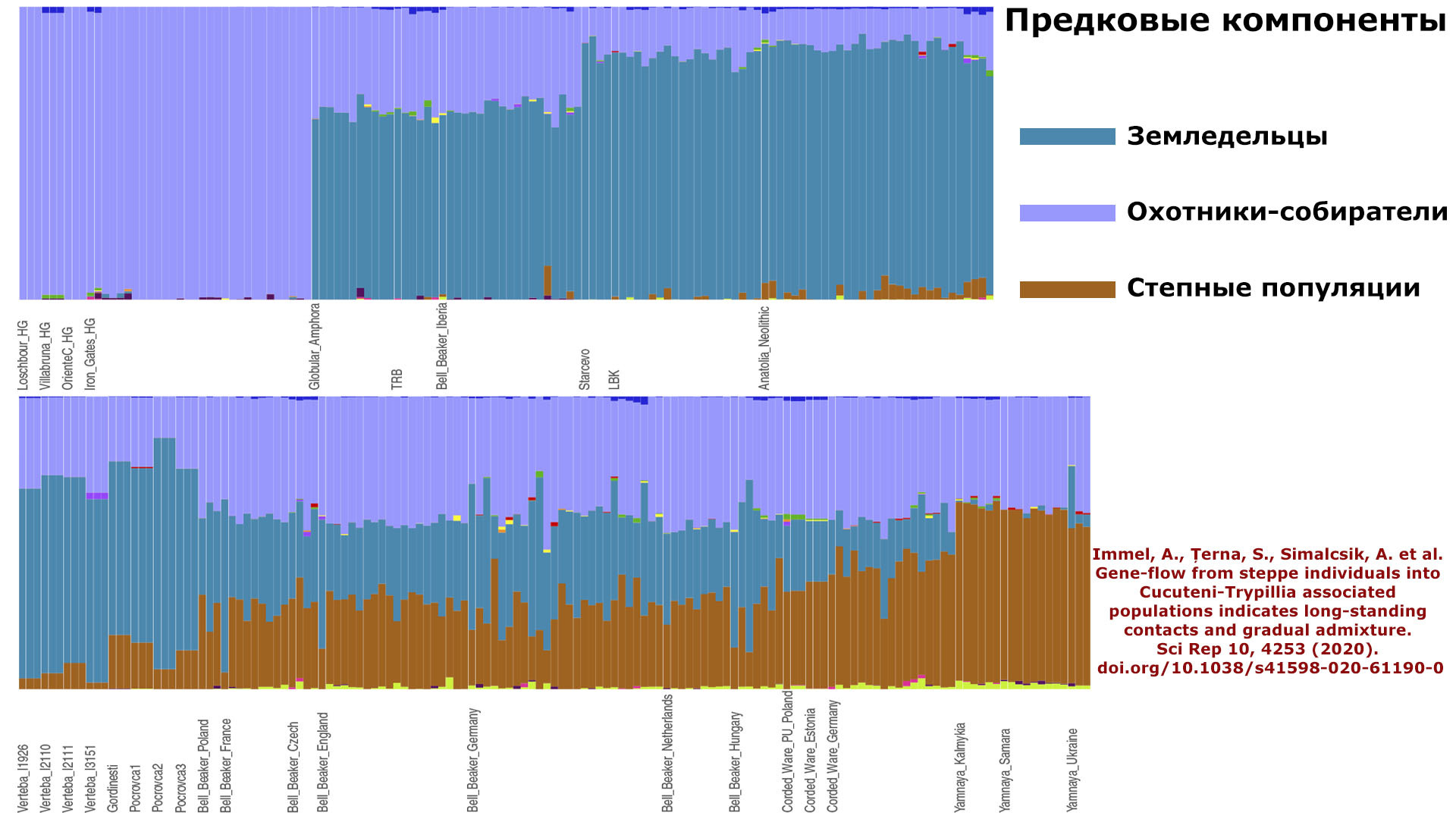 Immel, A., Țerna, S., Simalcsik, A. et al. Gene-flow from steppe individuals into Cucuteni-Trypillia associated populations indicates long-standing contacts and gradual admixture. Sci Rep 10, 4253 (2020). doi.org/10.1038/s41598-020-61190-0Авторы работы 2018 г. [Mathieson et al.] показали, что этот наследственный генетический компонент присутствовал у западных и восточных охотников-собирателей, населявших этот регион в эпоху неолита.
