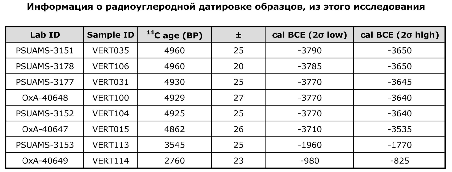Примеры травм у захороненных в пещере Вертеба (Violence at Verteba Cave, Ukraine: New insights into the Late Neolithic intergroup conflict G.D. Madden, J.K. Karsten, S.H. Ledogar, R. Schmidt, M.P. Sokhatsky doi.org/10.1002/oa.2633)В данном исследовании авторы реконструировали последовательности генома 20 человек (8 женщин и 12 мужчин), захороненных в пещере Вертеба. Восемь образцов датированы масс-спектрометрией по углероду-14 в интервале от 3790 до 825 гг. до н. э, что соответствует трипольской культуре и позднее. Шесть человек (образцы ВЕРТ-035, ВЕРТ-106, ВЕРТ-031, ВЕРТ-100, ВЕРТ-104 и ВЕРТ-015) датируются поздним энеолитом (3790–3535 гг. до н.э.), один (VERT-113) из Зоны 7 датируется средним бронзовым веком (1960–1770 гг. до н.э.) и один из Зоны 17 (VERT-114) датируется поздним бронзовым веком (980–825 гг. до н.э.).