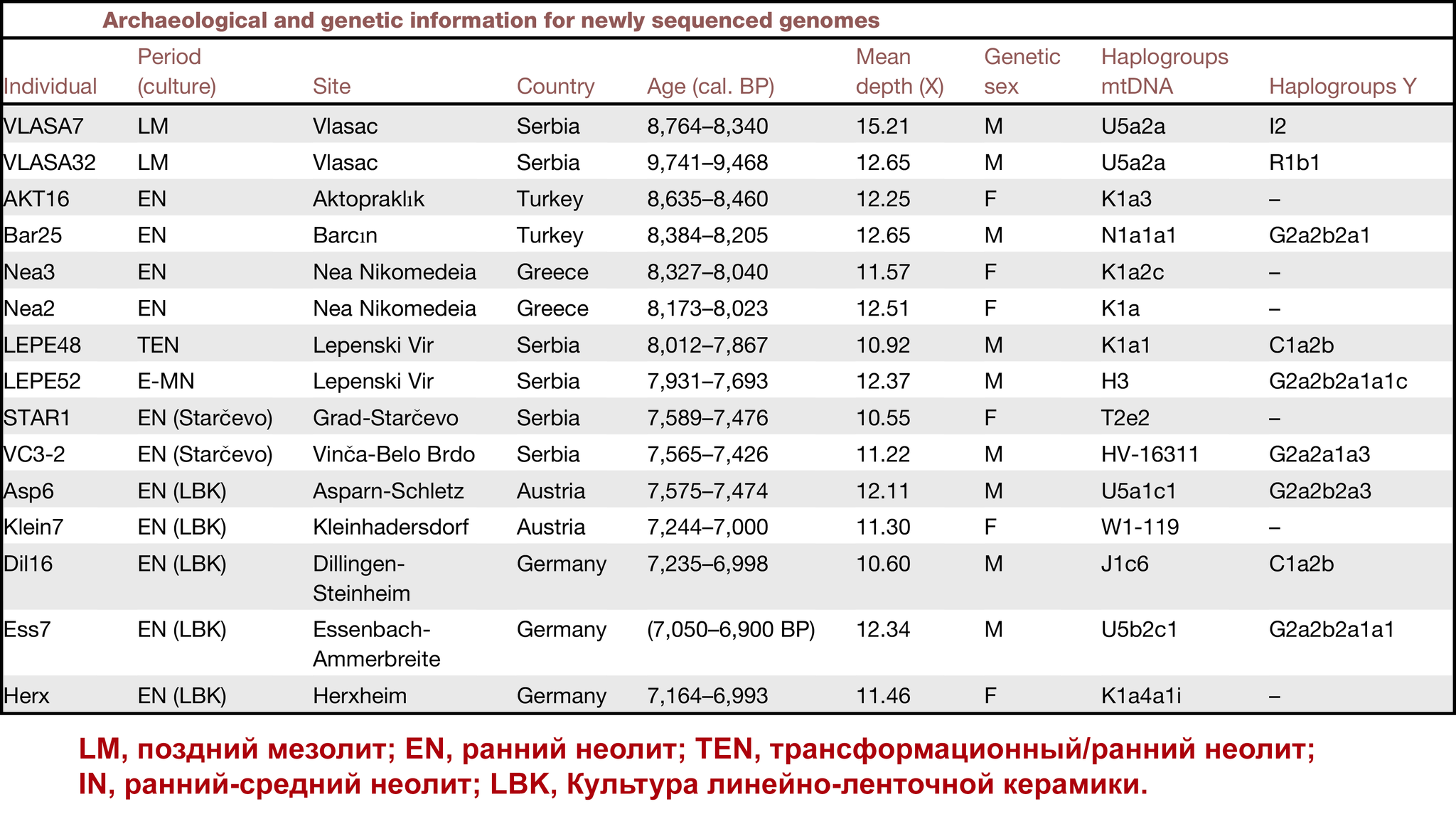 ДНК была извлечена из останков, найденных в пределах некоторых из наиболее важных археологических памятников раннего голоцена в Европе и Анатолии, включая первые поселения земледельцев в Эгейском бассейне (Барчин Хëюк, Актопраклик и Неа-Никомидия). Мезолитические и неолитические стоянки в районе Железных Ворот и других районах Центральных Балкан (Лепенски-Вир, Власац, Старчево и Винча-Бело-Брдо). А также старейшие кладбища или места массовых захоронений в Центральной Европе раннего неолита (Кляйнхадерсдорф, Аспарн-Шлётц, Эссенбах-Аммербрайт, Диллинген-Штайнхайм и Херксхайм).