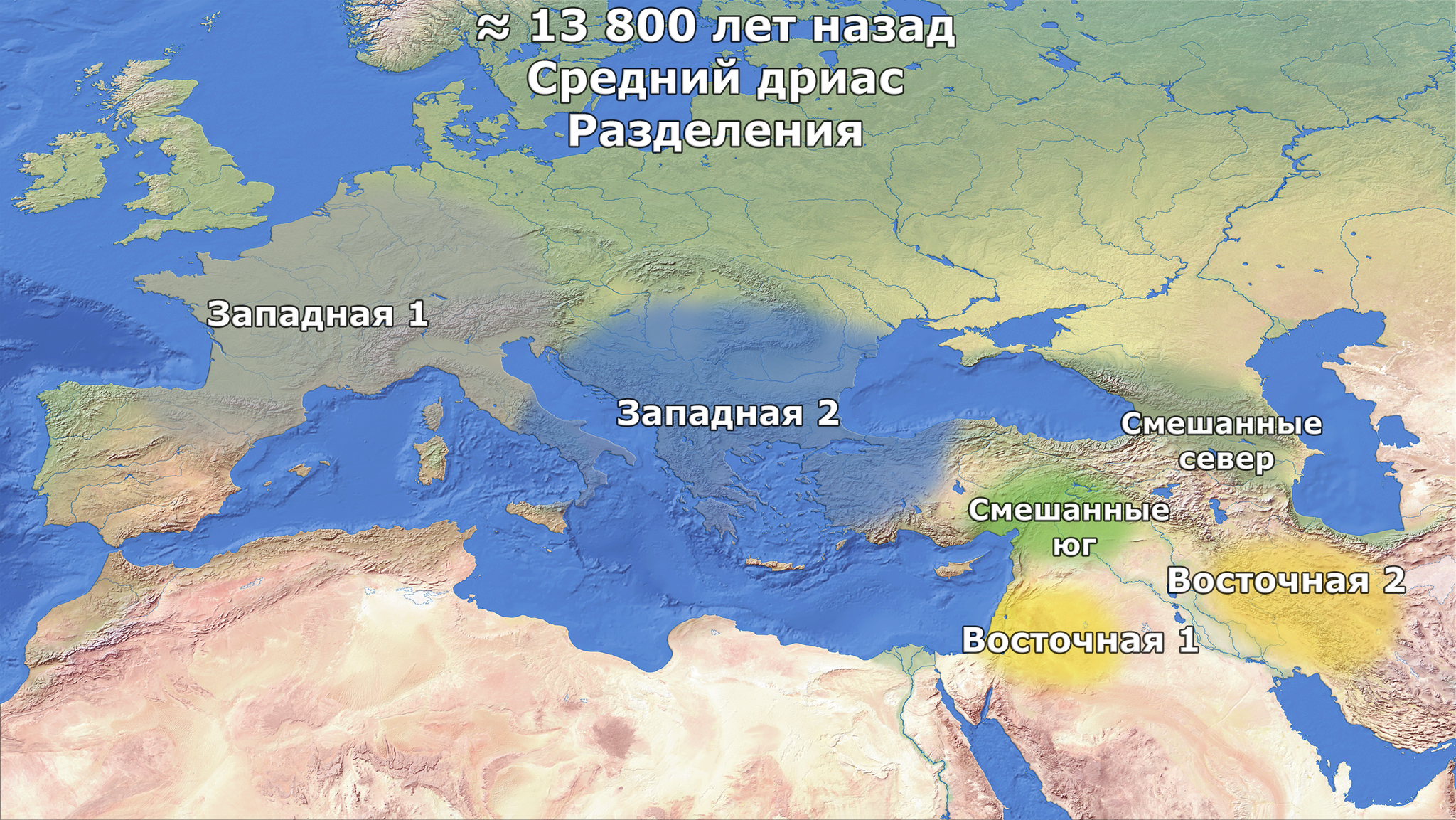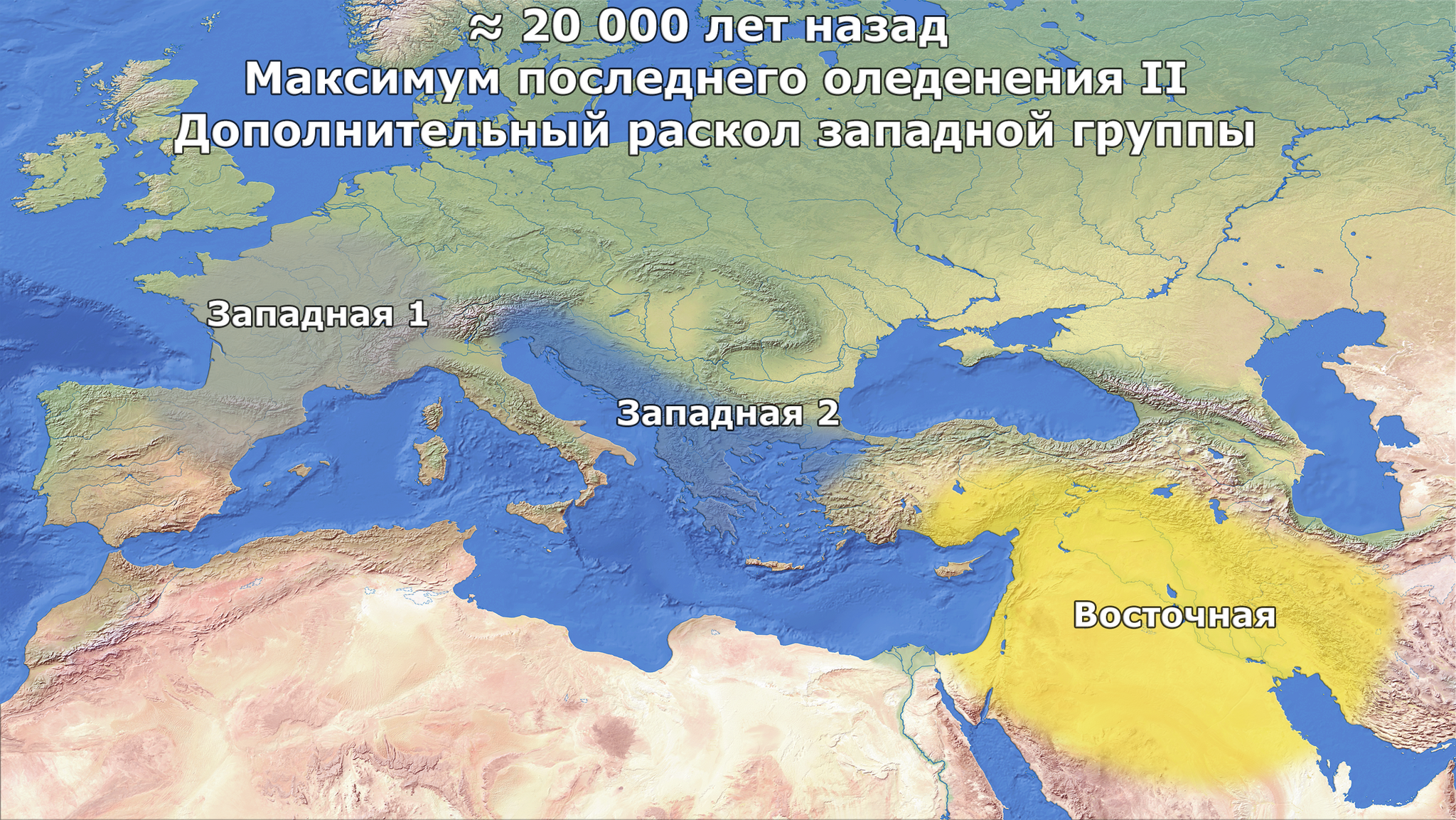 в конце максимума последнего оледенения охотники и собиратели - предки ранних земледельцев из Европы и Анатолии, которые, вероятно, были потомками популяции из эпиграветтского рефугиума, ≈14,2 тыс. лет назад смешались с популяцией, предковой как кавказским охотникам и собирателям, так и ранним западным земледельцам (Восточные 1).