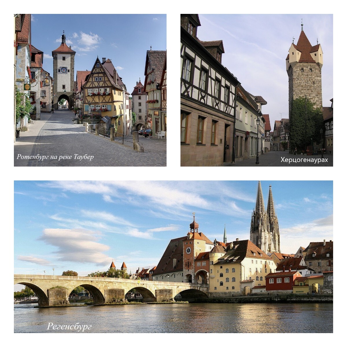 В Баварии множество старинных городков, сохранивших шарм и очарование средневековья. Стоит остановится на трёх из них. Ротенбург на реке Таубер покоряет атмосферой 12 века, и с тех пор в его облике мало что изменилось, – те же крепостные стены окружают готические кварталы с островерхими крышами. Регенсбург – один из старейших городов Германии, в котором хватает памятников ещё римской эпохи. Но настоящим символом города является Каменный мост, чудо инженерной мысли 12 века, ставший на несколько столетий образцом для почти всех европейских мостов, включая знаменитый Карлов мост в Праге. Но не только мост хранит дух далёких эпох, весь остальной исторический центр Регенсбурга также является мировым наследием. В Регенсбурге есть достаточно крепкая команда, SSV Jahn-Regensburg, участник второй бундеслиги.