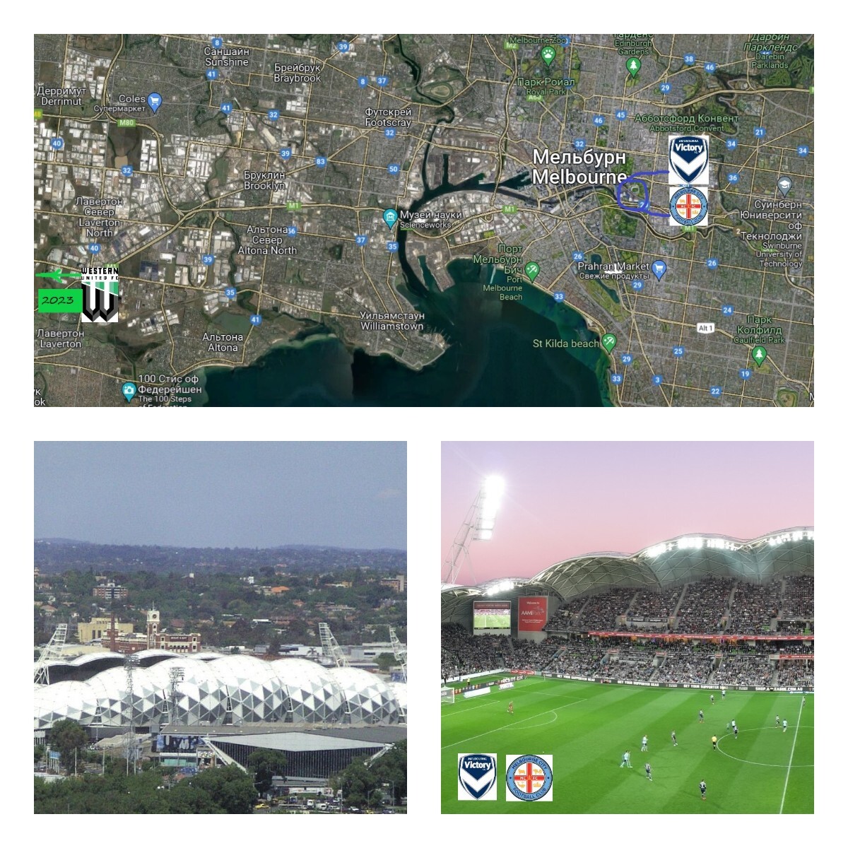 Виктори и Сити на двоих делят очень оригинальный стадион с названием «Прямоугольный стадион» 37°49'31.0"S 144°59'02.0"E – Google Карты, вмещает 31 тысячу, его крыша напоминает сетчатый геодезический купол. Он предназначен и для футбола, и для дико популярного в Австралии регби. Что касается Вестерн Юнайтед, то они свои домашние матчи проводят попеременно аж на 3 стадионах. Два за чертой Мельбурна, в городах-спутниках, в самом же Мельбурне они строят свою арену (открытие в 2023), а пока иногда арендуют тот же «Прямоугольный стадион».