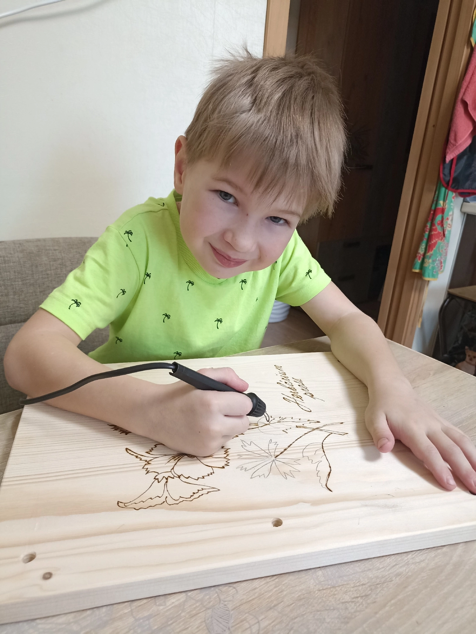 Ну а дальше все по порядку. Пилили, шкурили, сверлили. Нанесли узор выжигателем и покрыли лаком.