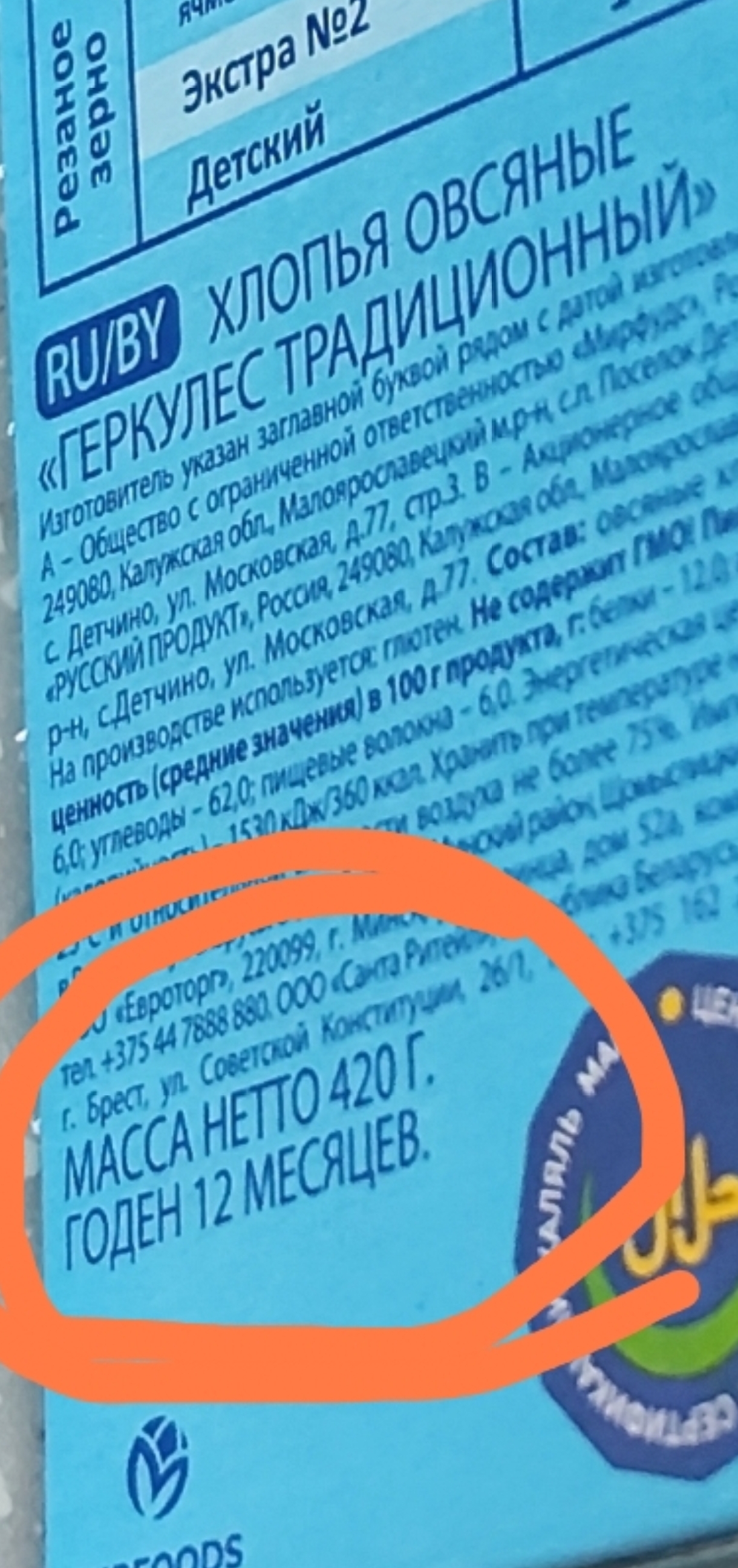 Но в этот раз, вскрывая утром новую пачку из новой партии, и высыпая в кастрюлю, внезапно поймал себя на мысли, что коробка полупустая и очень лёгкая. Посмотрев на вес в 420 г, мои опасения оправдались. Оказывается умные руководители ООО "Мирфудс" решили уменьшить вес крупы в пачке на 16% с 500 гр до 420 гр., чтобы провести лотерею для дурачков и в дальнейшем выиграть призы для своих сотрудников. Текст веса пачки стыдливо уменьшили до не читаемого размера.