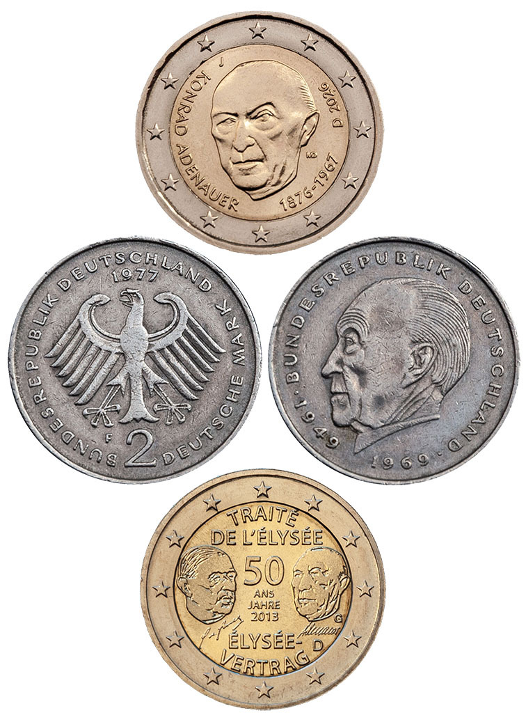 Мини-серия одинаковых монет, выпущены Францией и Германией в 2013 году. Тем самым Конрад Аденауэр уже третий раз появляется на юбилейных монетах евро!