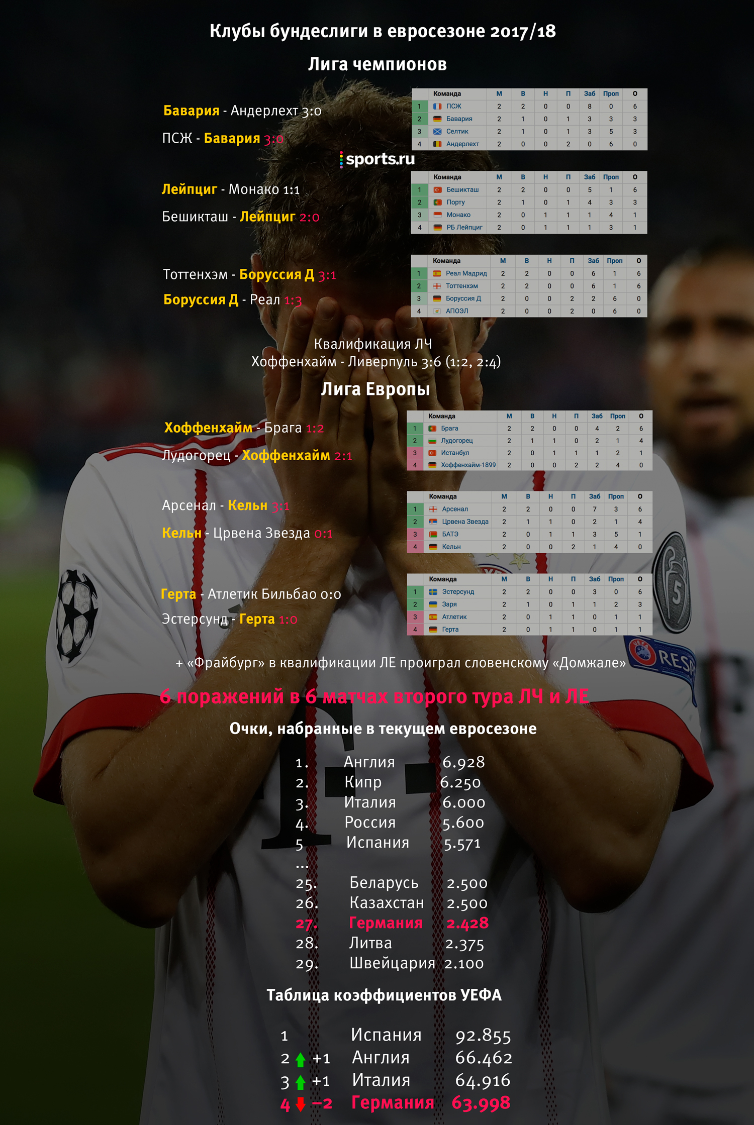 Прошлый еврокубковый сезон немецкие клубы закончили на втором месте в таблице коэффициентов УЕФА: Испания давно оторвалась неприлично далеко, а вот итальянскую серию А и, что особенно приятно, гораздо более богатую и популярную АПЛ бундеслига уверенно опережала. В новом сезоне все поменялось: клубы из Германии пока играют удивительно плохо. Вот смотрите: