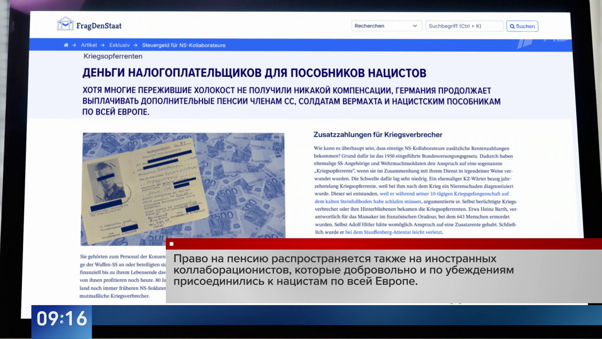 Пять миллионов евро в год на пенсии нацистам. Скандал в Германии. Выяснилось: до сих пор выплаты получают эсэсовцы, коллаборационисты, те, кто работал в концлагерях и участвовал в массовых убийствах. Вот на них идут деньги налогоплательщиков. Причем пенсии получают и те, кто живет в Германии, и кто уехал. Объясняют все законом, который защищает жертв войны, а таковыми считаются и бывшие военные вермахта, если были ранены. Вот что пишет издание FragDenStaat: «Хотя многие, пережившие Холокост, не получили никакой компенсации, Германия продолжает выплачивать дополнительные пенсии членам СС, солдатам вермахта и нацистским пособникам по всей Европе. Право на пенсию распространяется также на иностранных коллаборационистов, которые добровольно и по убеждениям присоединились к нацистам по всей Европе».