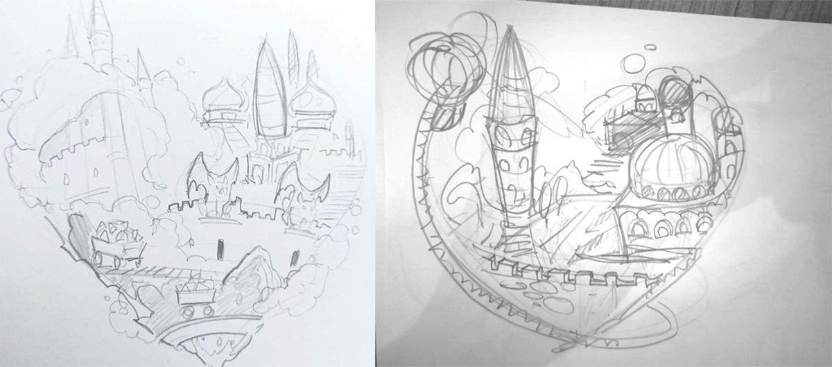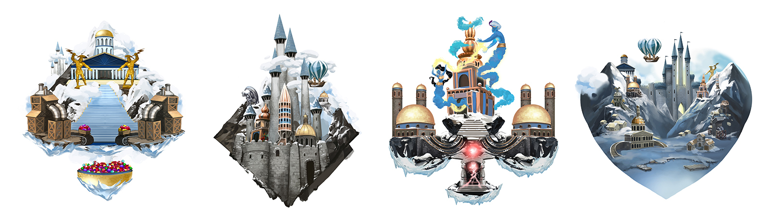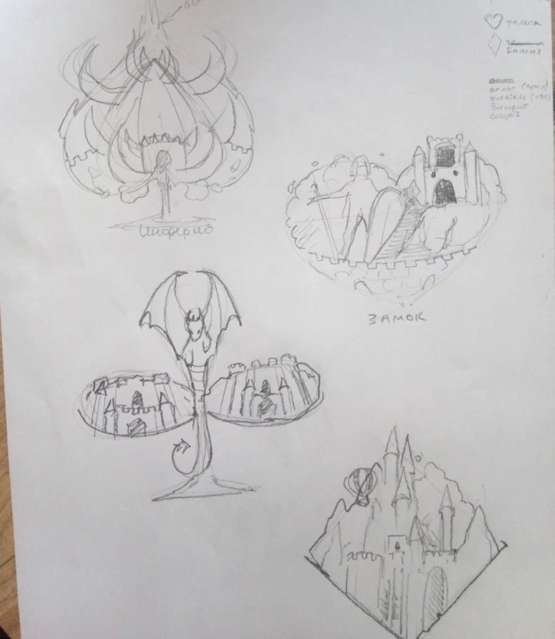 С трефой оказалось тоже не просто, сама форма масти очень не простая и совместить идею о строениях располагающихся на ней, было крайне тяжело. Изначально, это была фабрика големов с парапетом, были так же мысли о гильдии магов расположенной в центре.
