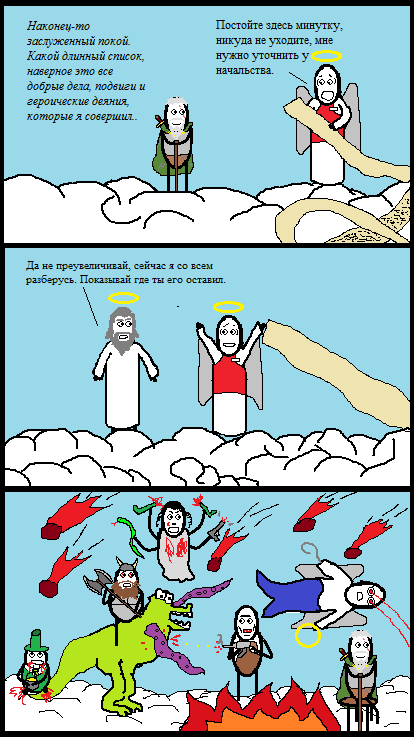 Герой разозлился из-за того, что дракон ассимилировался с окружающим миром и больше не является абсолютным злом, уходя громко хлопнул дверью, из-за чего одна из наград упала с полки и разбила подаренный телевизор. О проблемах дракона с управлением гневом и телевизорами к сожалению можно узнать только из моих предыдущих работ, ровно как и понять почему на его дне рождения присутствует демон, или почему ангел в бонусе носит красный жилет.
