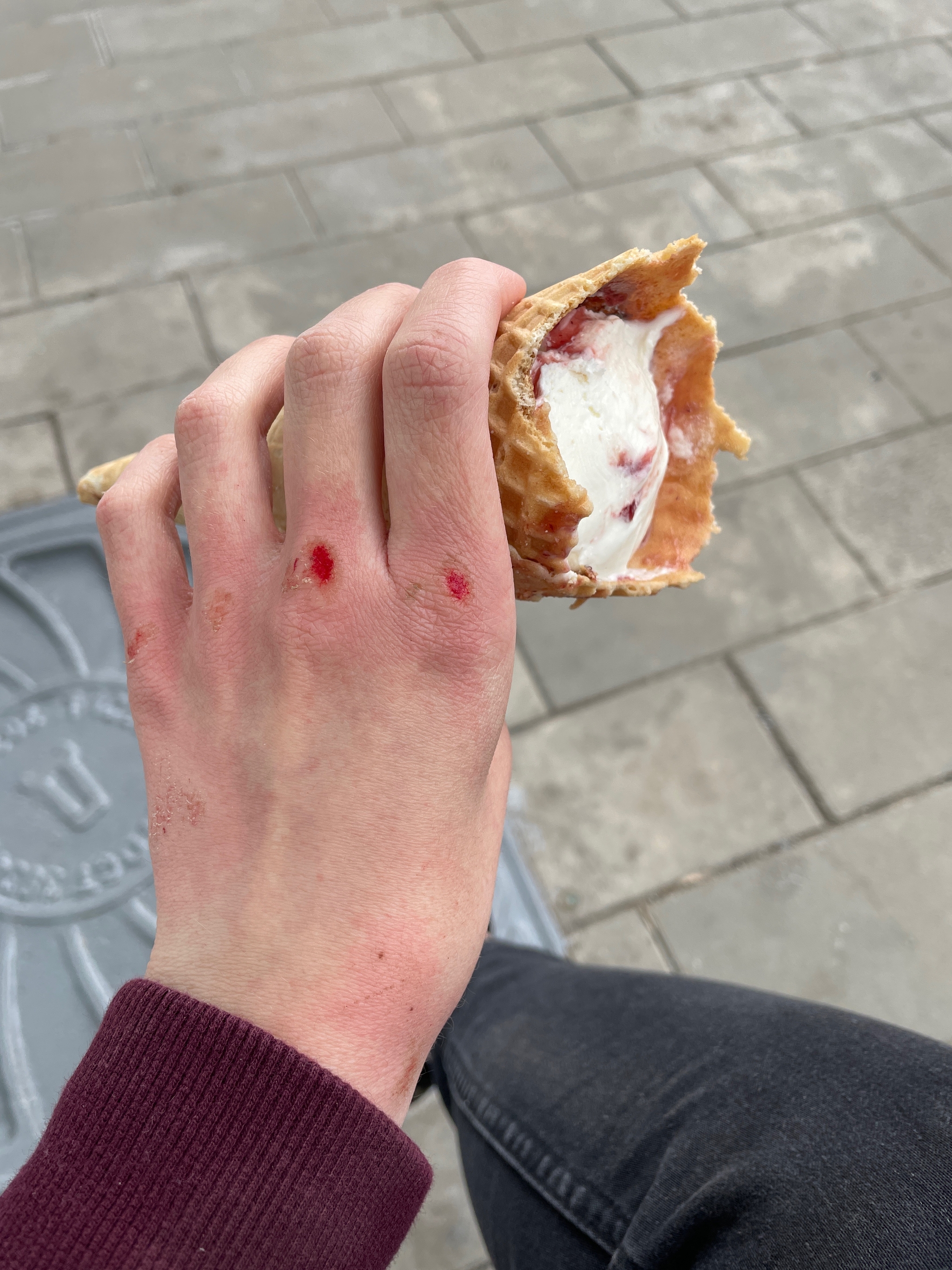 И вот роковой день для моего лица - 9 апреля. Я на скейте, спутник на велосипеде, самокат от Яндекса на велодорожке, моя уверенность в себе и способности остановиться, горочка, бабушка в розовом трико и люк посреди велодорожки.