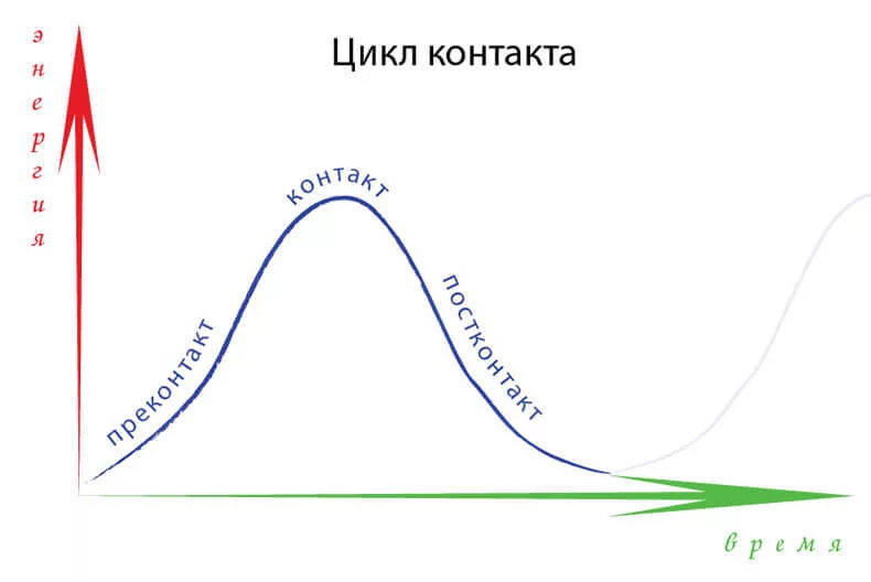 6. Удовлетворение и отступление: потребность удовлетворена. Появляется чувство завершенности. Энергия спадает. Контакт естественно завершается. Фигура растворяется, внимание освобождается для нового.