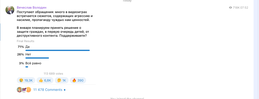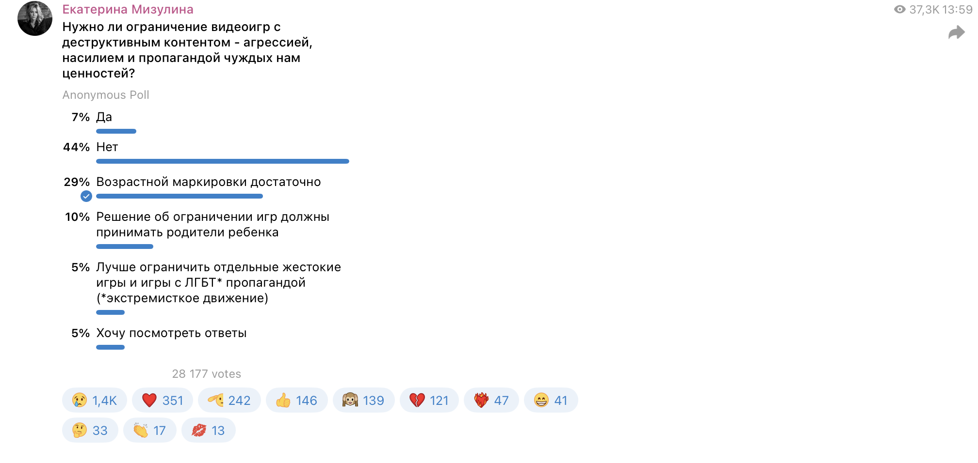 Екатерина Мизулина присоединилась к движухе. Результаты опроса на её канале несколько отличаются от полученных у Вячеслава Володина