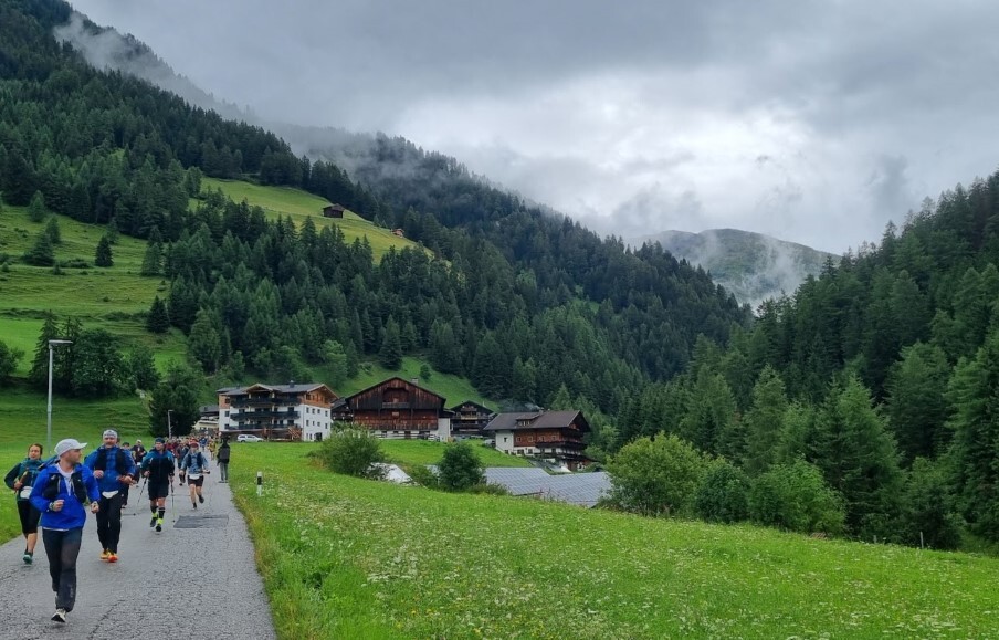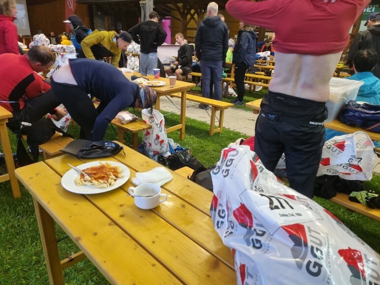Достигаем городка с названием Кальс, это почти половина трассы, перерыв на обед (в 8 утра) и переодевание, здесь наши вещи из заброски. Переодеваться мне совсем не хочется, да, я мокрый, но мне тепло, кроссовки с носками тоже мокрые, но - как-то все внутри хорошо притерлось, никаких намеков на мозоли! Класс. Игнорирую свою заброску, съедаю по быстрому тарелку макарон, даже не садясь на скамейку (как всегда в таких случаях - это самые вкусные макароны, которые когда-либо ел)), пью чашку горячего чая с батончиком - все, готов! Выхожу. По прогнозу, нас ожидают еще и грозы, хочется пройти как можно дольше, до их начала.