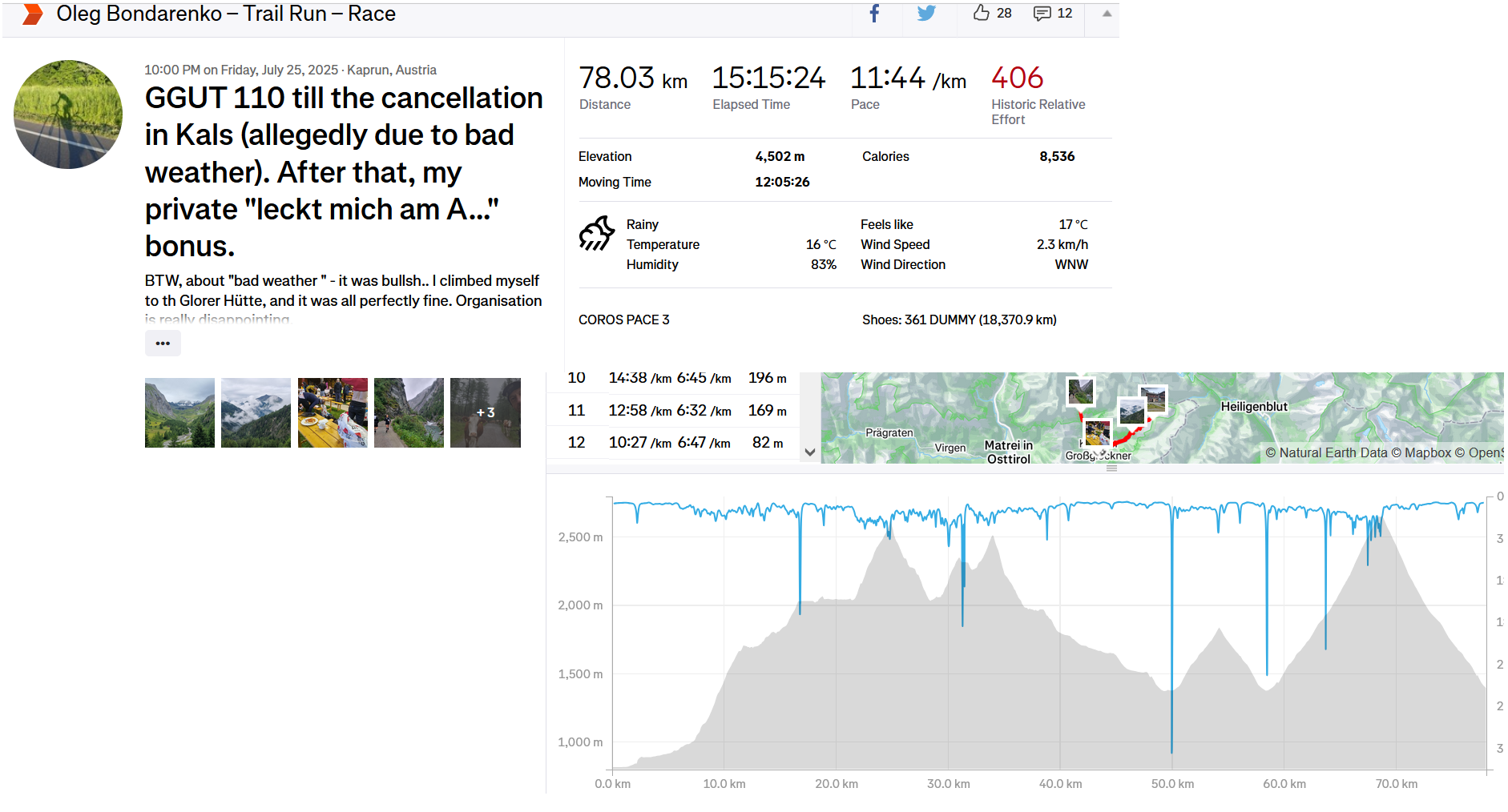Финишировали восемь человек из 400, те, кто успел пройти чекпойнт у хижины до остановки забега. У некоторых из них одна из центральных австрийских газет взяла интервью, они рассказывали, какая была на дистанции жесть: холод, ледяной дождь итд. Явный месседж остальным недовольным участникам (коих было немало в Фэйсбуке): орги все сделали правильно, радуйтесь! Как я уже сказал - я не наблюдал ничего похожего на вершине, но в горах все меняется за 15 минут, так что - все может быть, не будем ударяться в конспирологию и возрадуемся. Нно… Через фейсбук и страву я нашел одного бельгийца, участника короткой дистанции, 57км, который в фейсбуке утверждал, что на всем остатке дистанции условия были ок. Откуда он знал? Этот парень, после официальной отмены не спустился в Кальс, а сказал всем “поцелуйте меня в ж…”, отдал свой номер и передатчик волонтерам, и - прошел всю оставшуюся дистанцию сам! Круто, а?