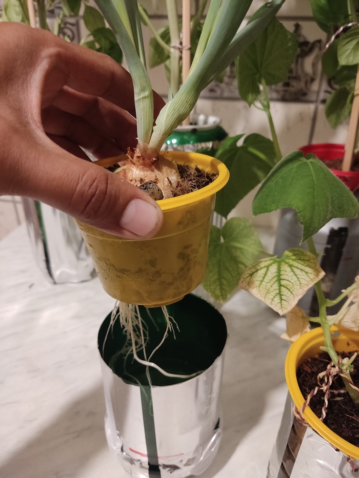 Базилики все, еще зеленый лук на перо из луковицы и два огурца. Листья на базиликах опали, так как сосуда не хватает, вода сильно падает к вечеру и естественно засоленность растёт. Сегодня купил банку 1.5 литра, попробуем ее, как она себя покажет. Но все равно, все, кто боится гидропоники - уверяю вас, в сравнении с землей, тут загубить растение сложней, дефицитов почти нет, в земле так и сохнут, желтеют.