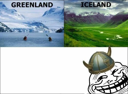 У них так "исторически сложилось" буквально. Гренландию нашли во время средневекового климатического оптимума, когда ледники сильно отступили и побережье Гренландии действительно было зеленым. А Исландию открыли лет на 200 раньше, когда последствия климатического минимума раннего средневековья в виде разросшихся ледников ещё не совсем растаяли