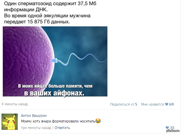 5. Таким образом, пропускная способность мужского члена будет равна (37.5 Мб x 100M x 2.25)/5 = (37 500 000 байт/сперматозоид x 100 000 000 сперматозоид/мл x 2.25 мл) / 5 секунд = 1 687 500 000 000 000 байт/секунду = 1,6875 Терабайт/с Получается, что женская яйцеклетка выдерживает эту DDoS-атаку на полтора терабайта в секунду, пропуская только один выбранный пакет данных и является самым офигенным в мире хардварным фаерволом… Но тот один пакет, который она пропускает, кладет систему на 9 месяцев…