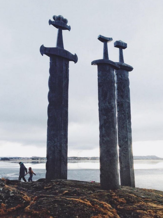 Памятник «Мечи в Камне», расположенный недалеко от норвежского города Ставангер, был установлен в память о сражение в 872 году. Большой меч является символом короля Харальда Прекрасного, ставшего победителем в битве, два поменьше - королей, которые были побеждены. Воткнутые мечи в камень, это символ мира, говорящий, что они никогда не поднимутся вновь.