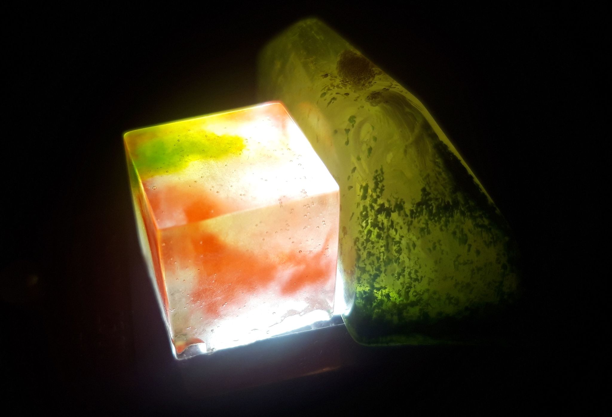 Для достижения различных эффектов можно варьировать густоту смолы: разведённую смолу можно выдержать 10..40 минут перед добавлением краски, чтобы она загустела. Можно капать различное количество красителя. Больше белого- больше потёков. Можно капать в разные углы чернила разного цвета, но на маленьких формах это работает плохо, цвета часто перемешиваются. Можно добавлять в смолу разные предметы, но помним, что это должно хорошо смотреться на просвет. Можно налить слой слегка окрашенной смолы, потом слой прозрачной, затем чернила. В общем, простор для экспериментов.