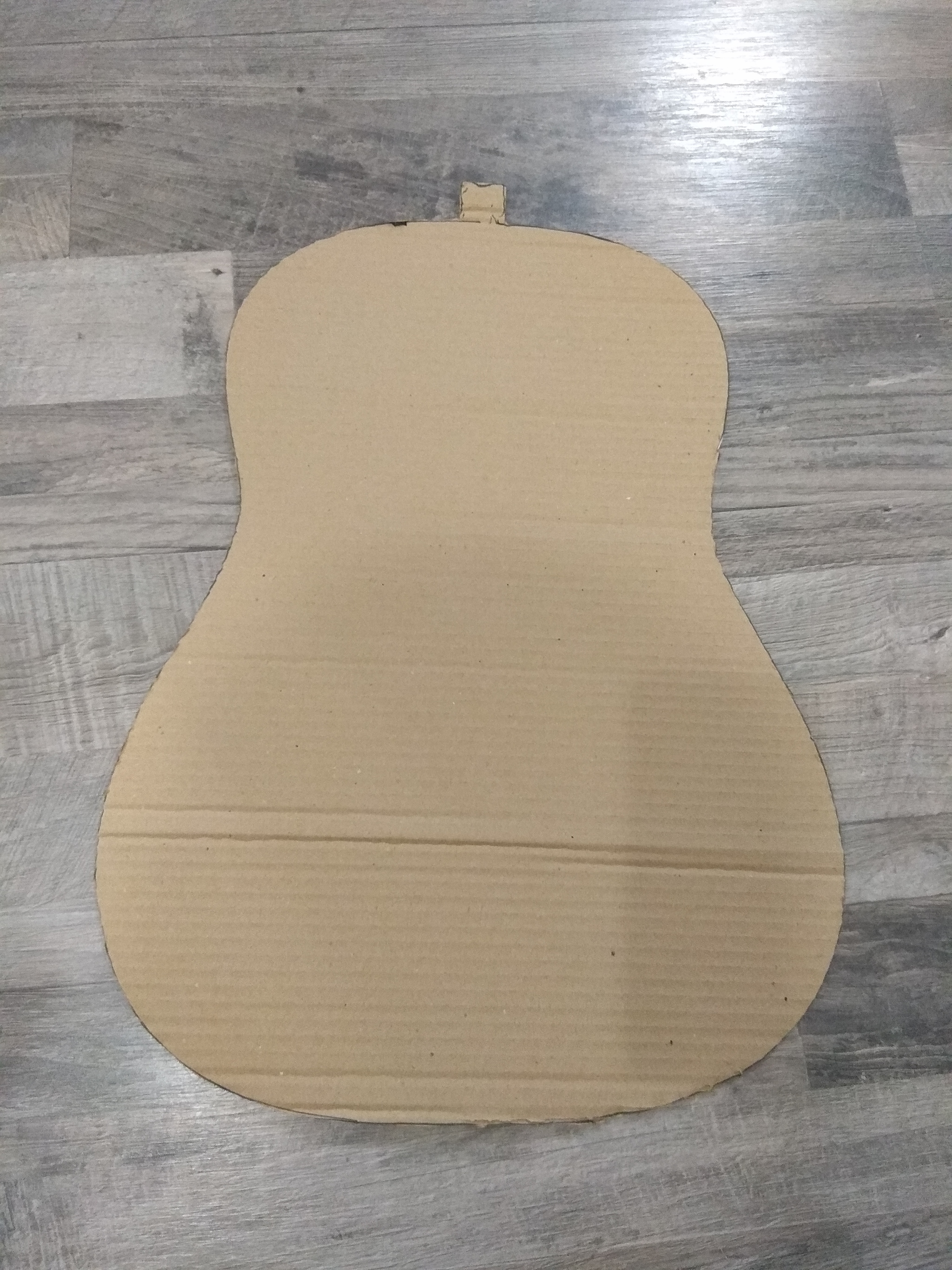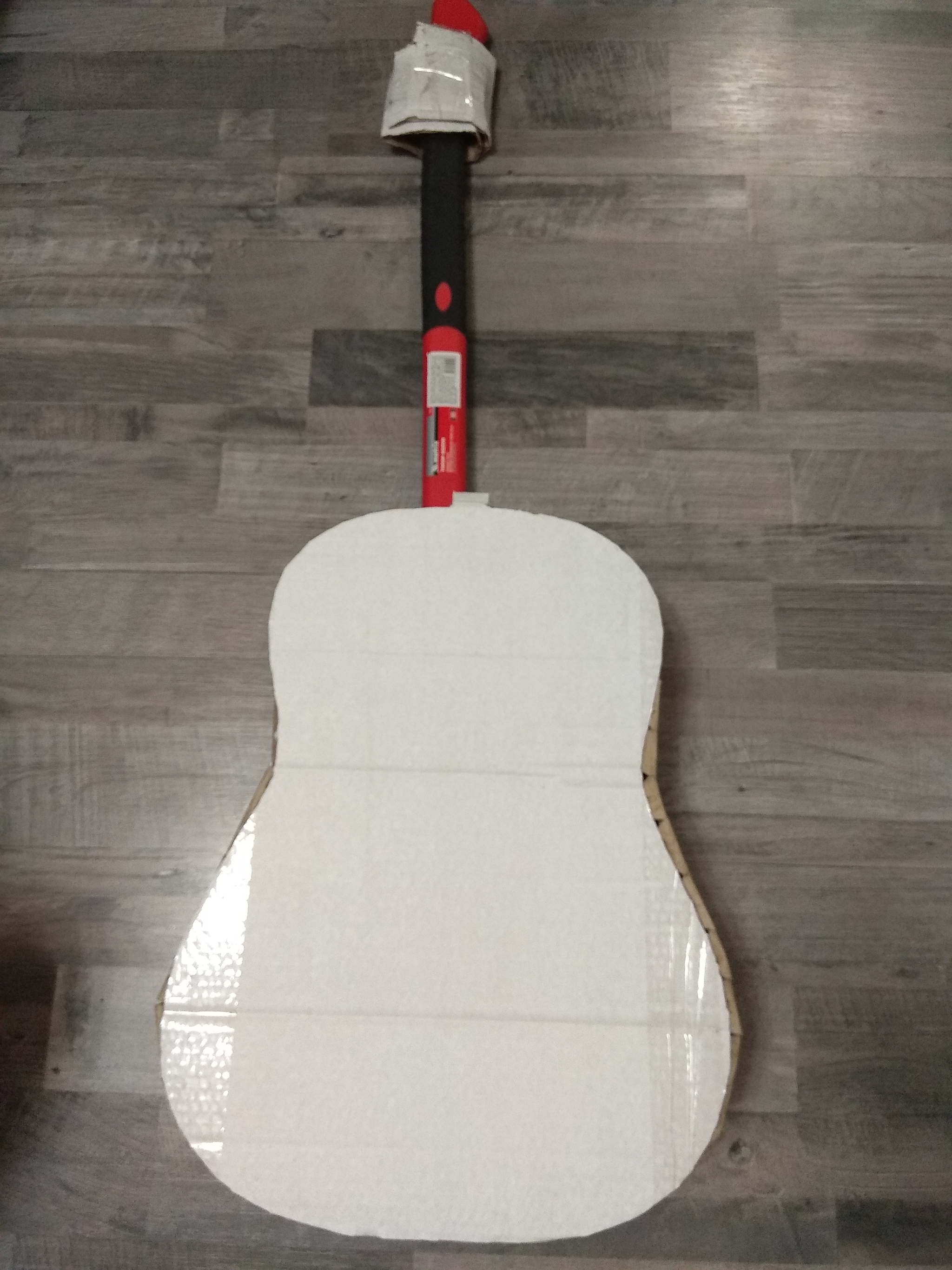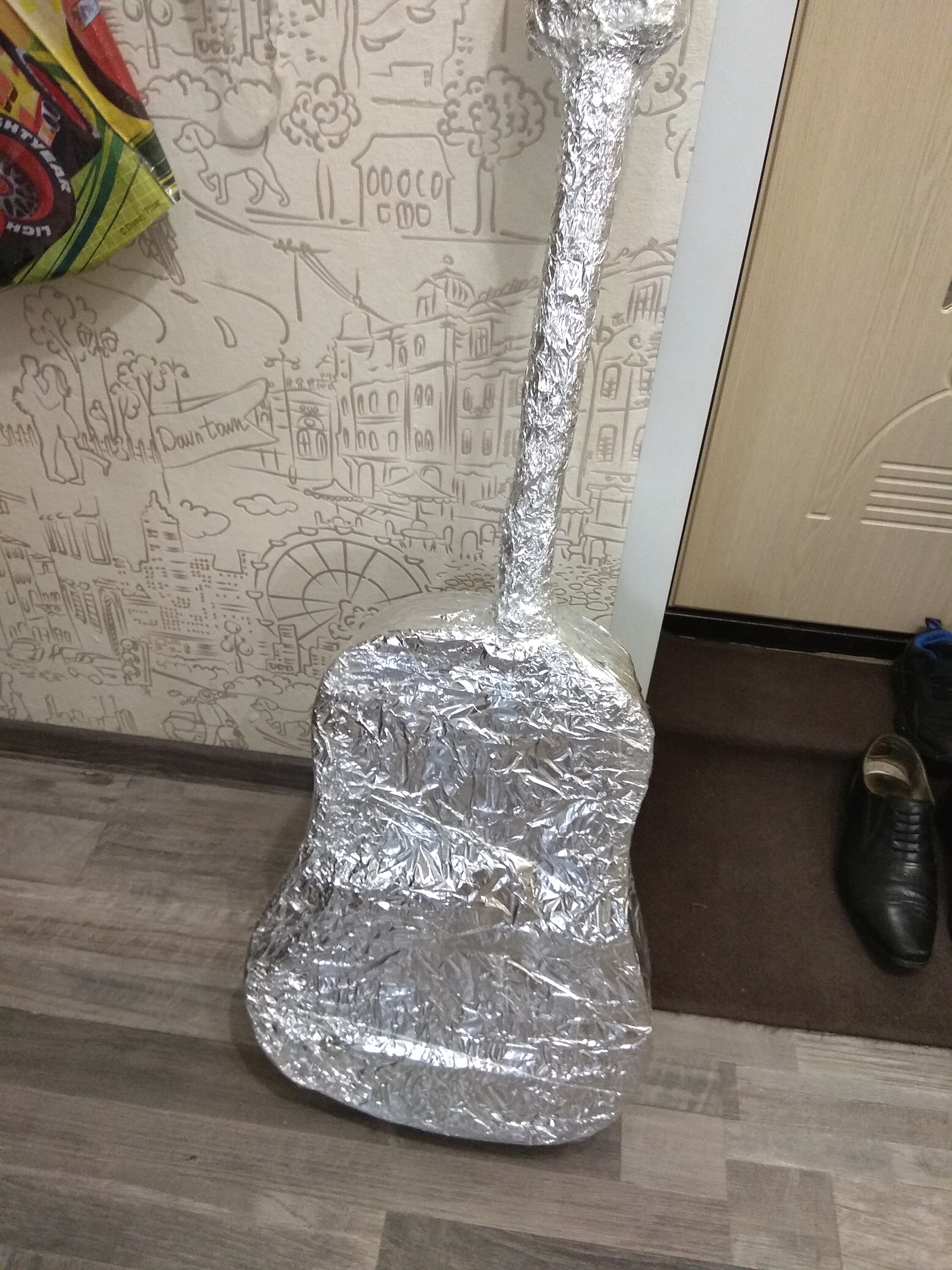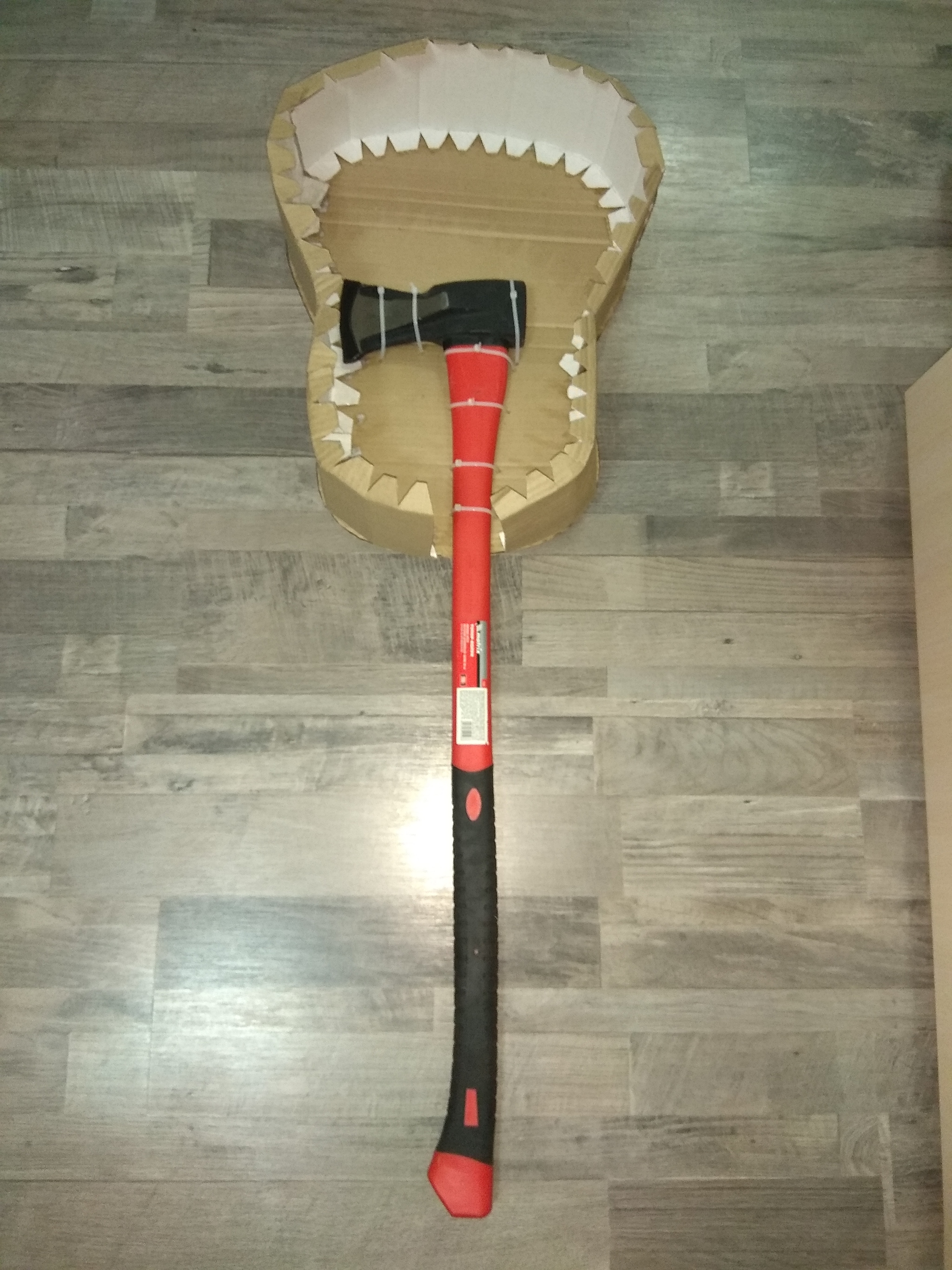 Вид подарка, решил оформить топор в виде гитары, сначало думал купить сломанную гитару и вместо грифа воткнуть топор, но в моем городе сломанного не продавали, а цены начинались от 2р. Решил делать корпус из картонной коробки
