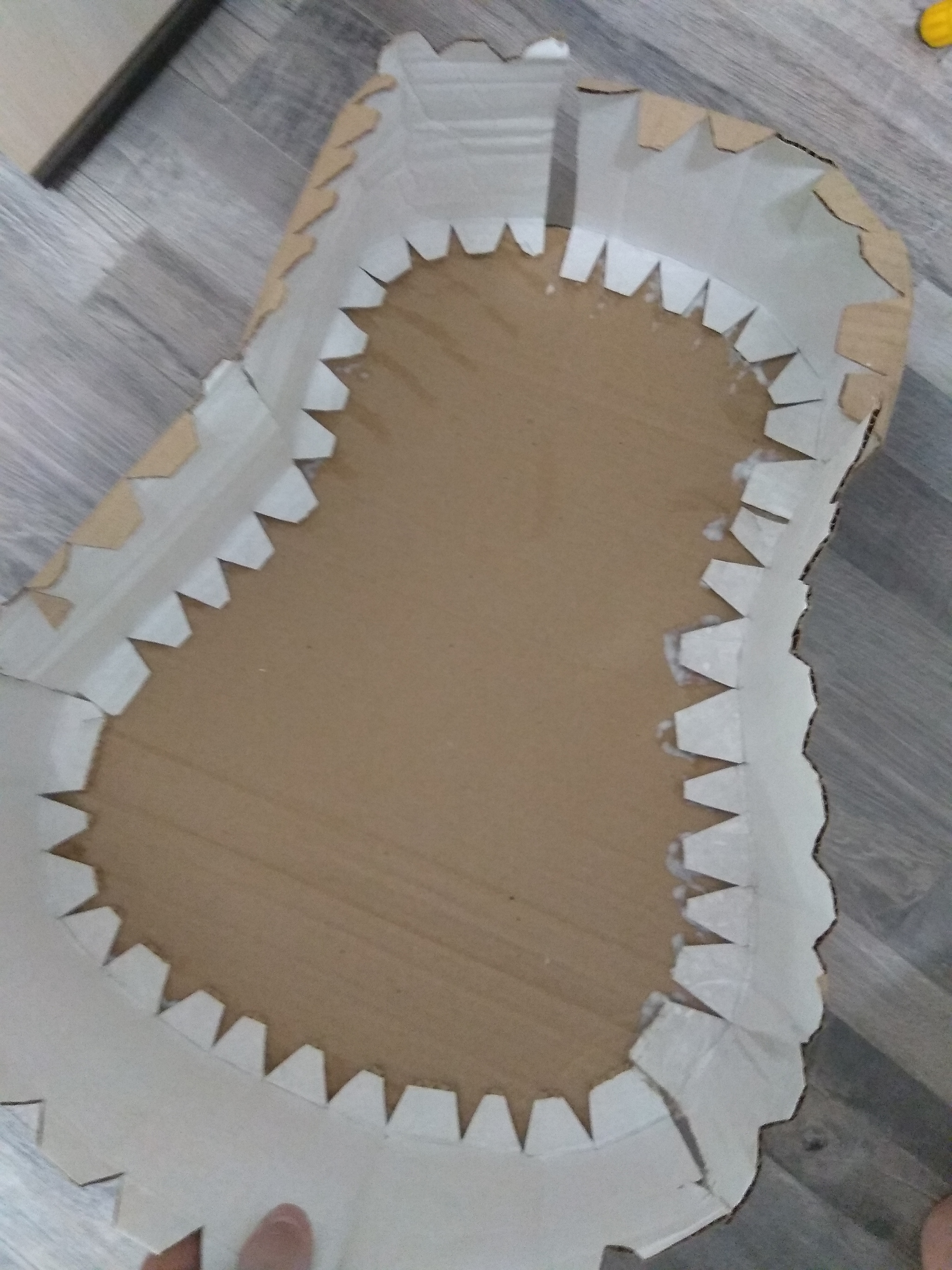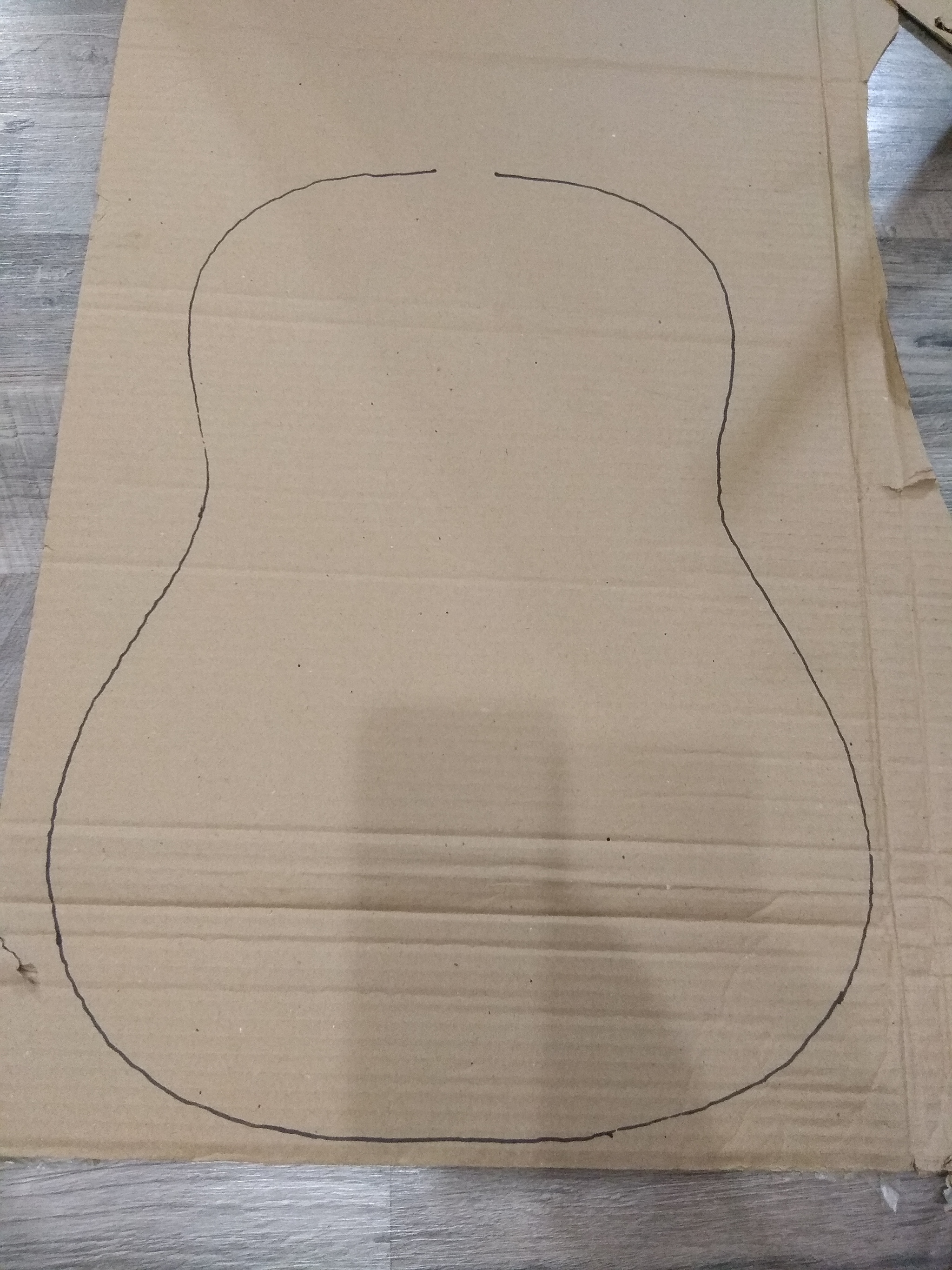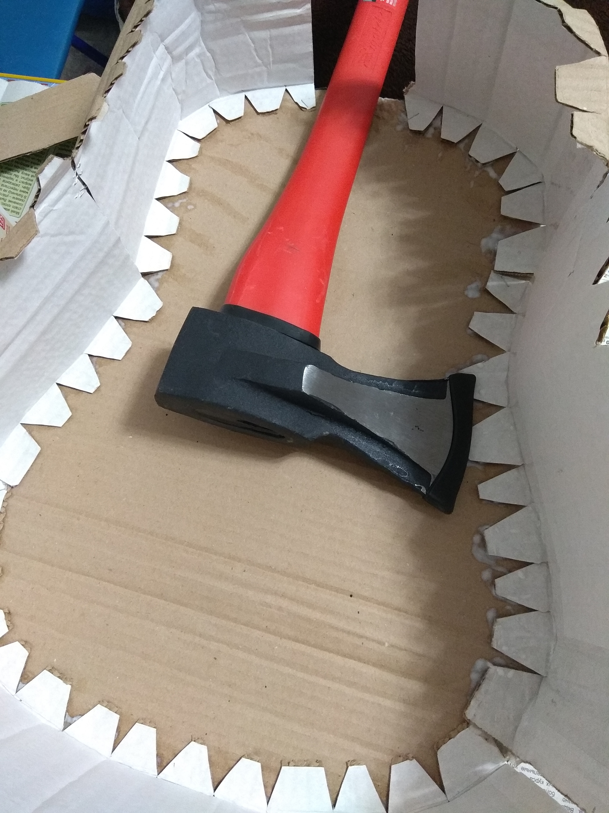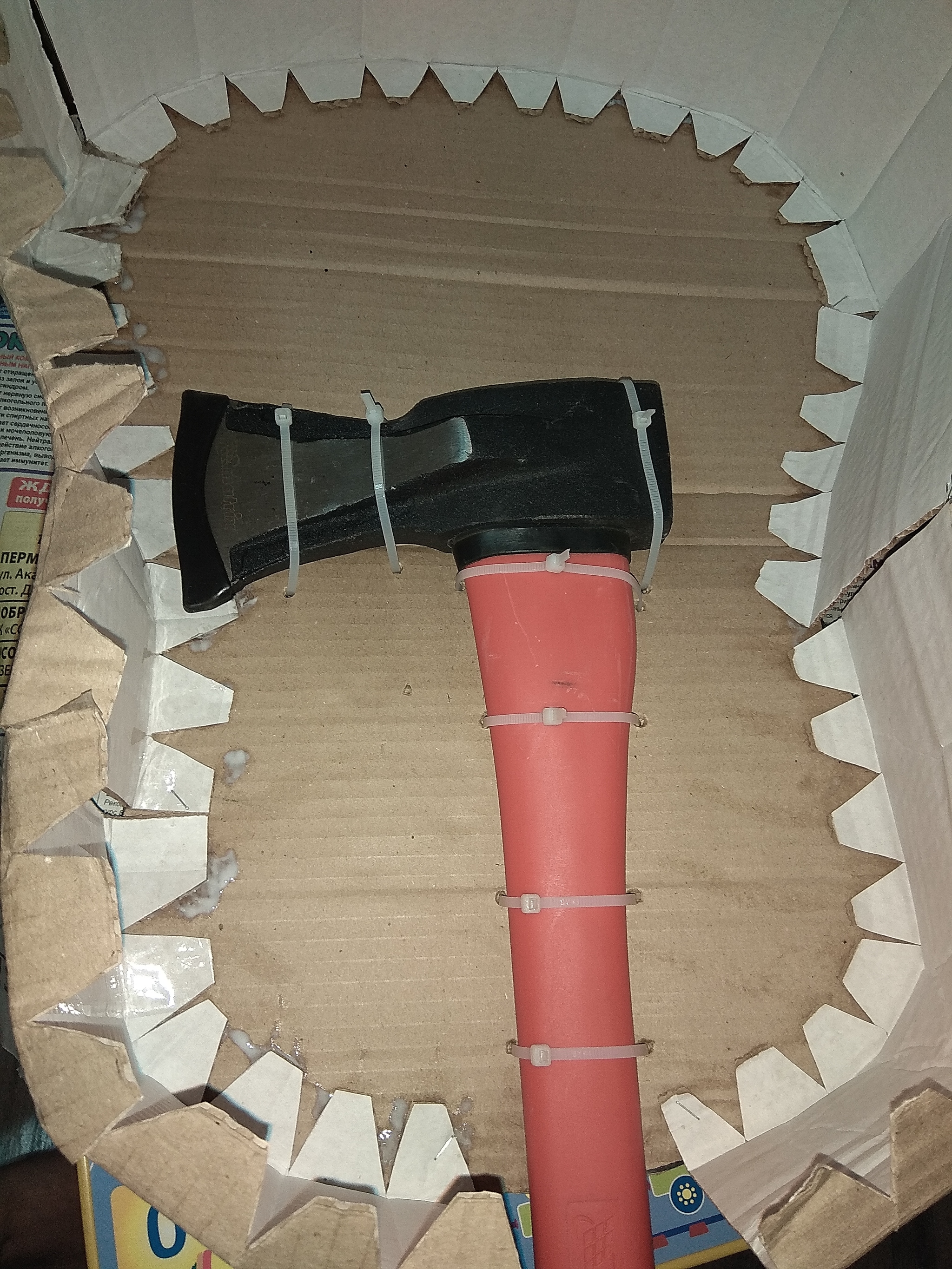 Вид подарка, решил оформить топор в виде гитары, сначало думал купить сломанную гитару и вместо грифа воткнуть топор, но в моем городе сломанного не продавали, а цены начинались от 2р. Решил делать корпус из картонной коробки