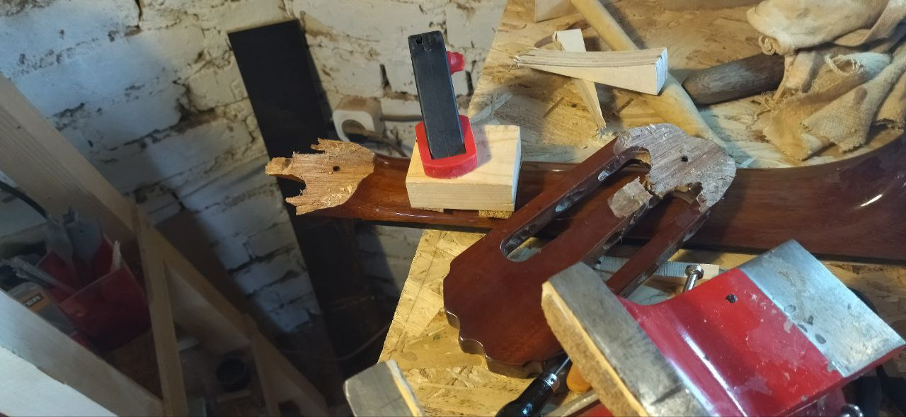 Теперь надо что-то сделать с отверстиями под колки. Мы помним, что предыдущий хозяин этой гитары был бобром и сгрыз их. Поэтому выгребаем всё лишнее оттуда.