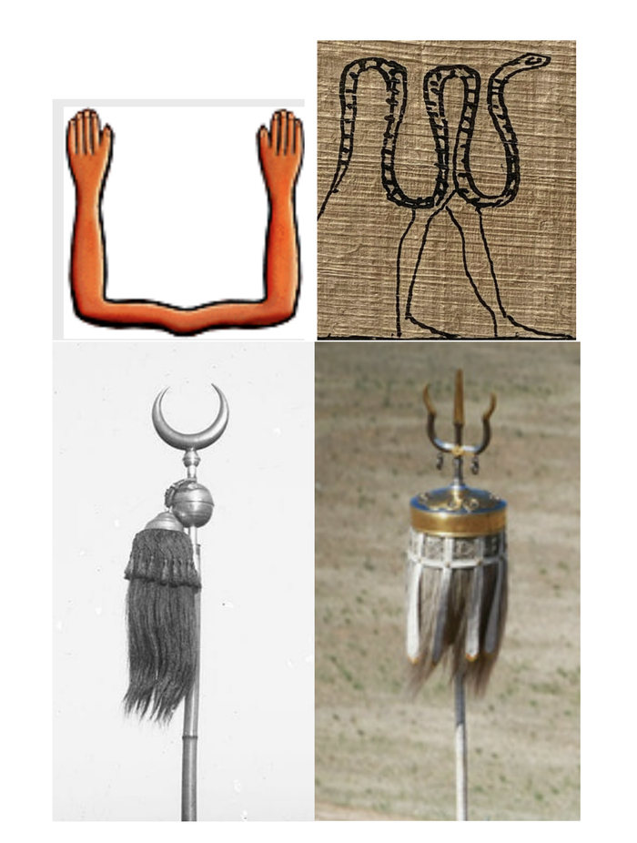В первом через -символ бога Египта Нехебкау -руки вверх.