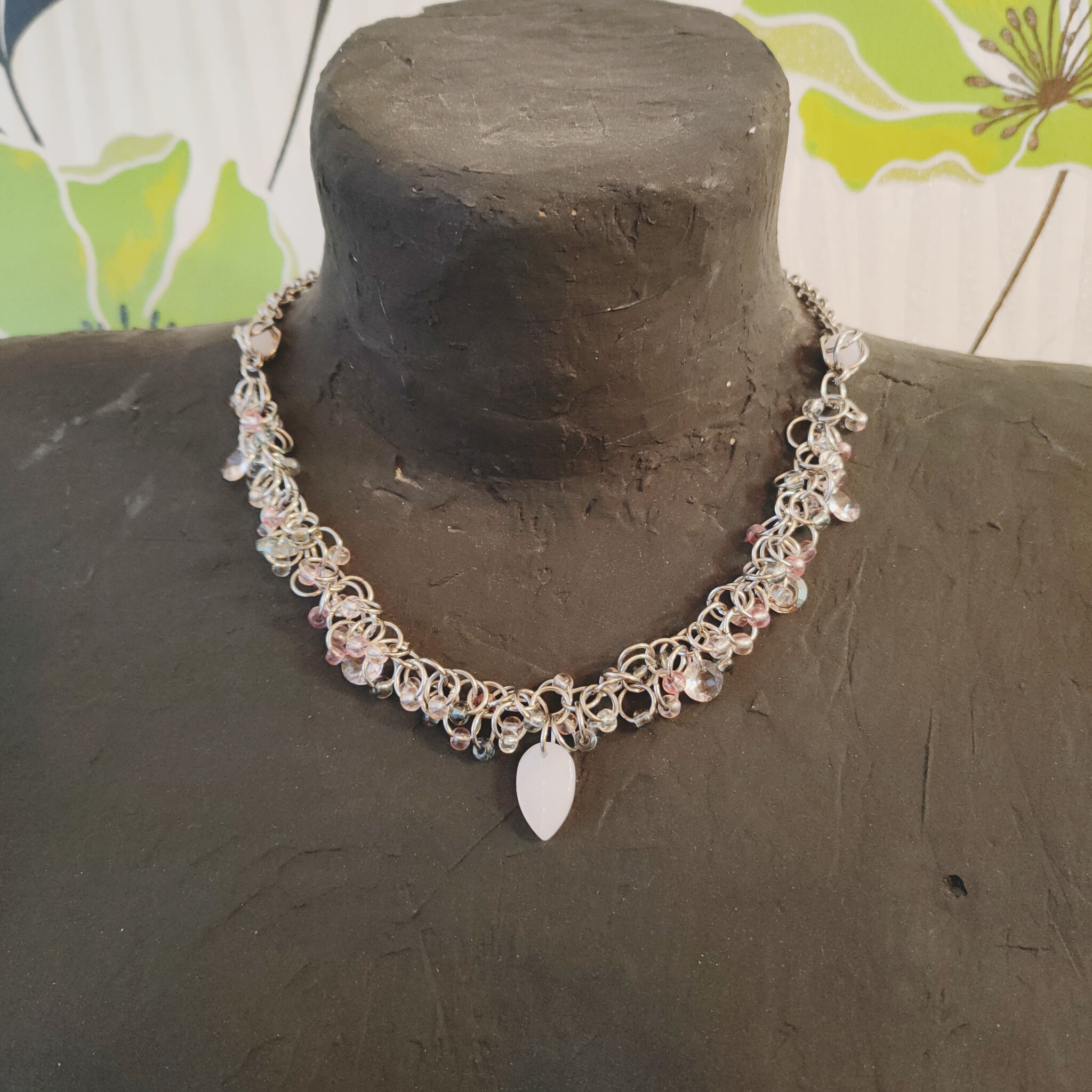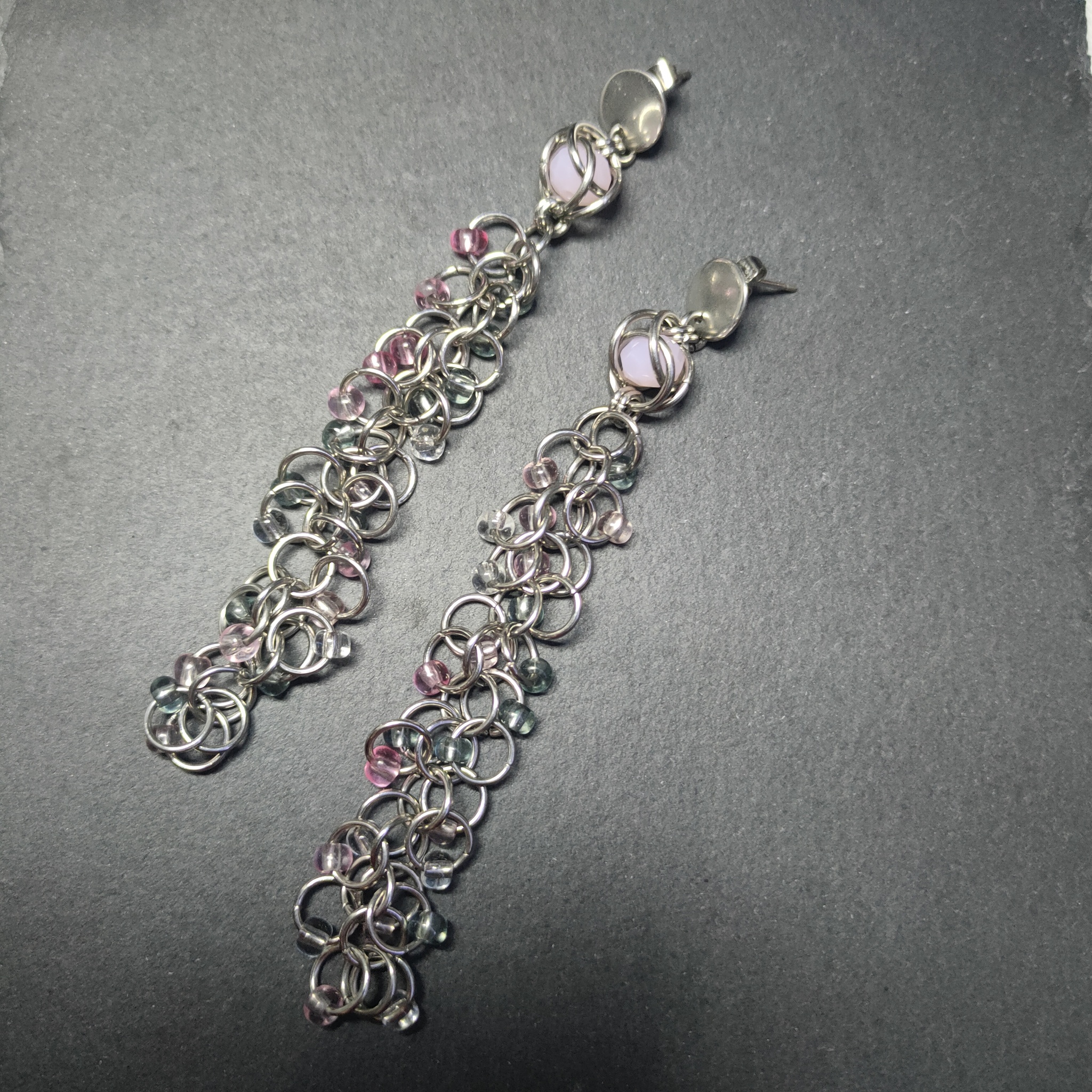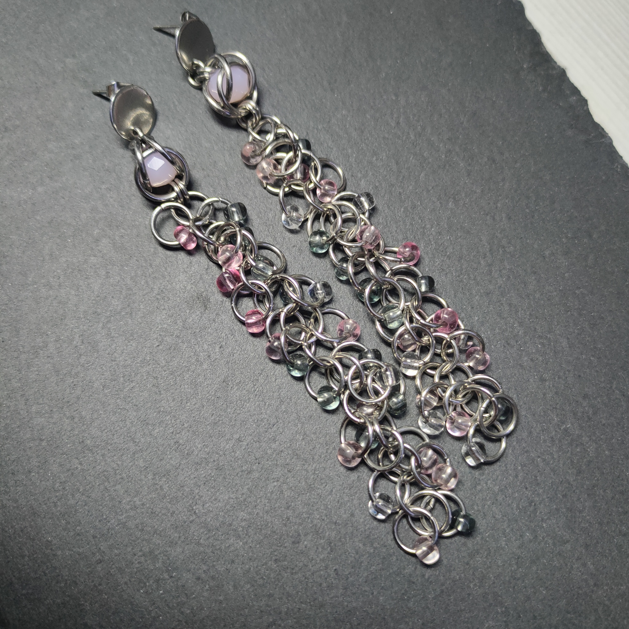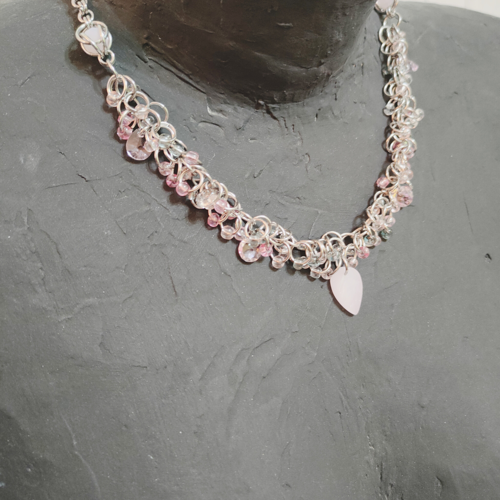 Легкий комплект из плетений shaggy loops и capture beads, розовое стекло, микс серо-розового бисера и немного хрусталя и фианитов для блеска.