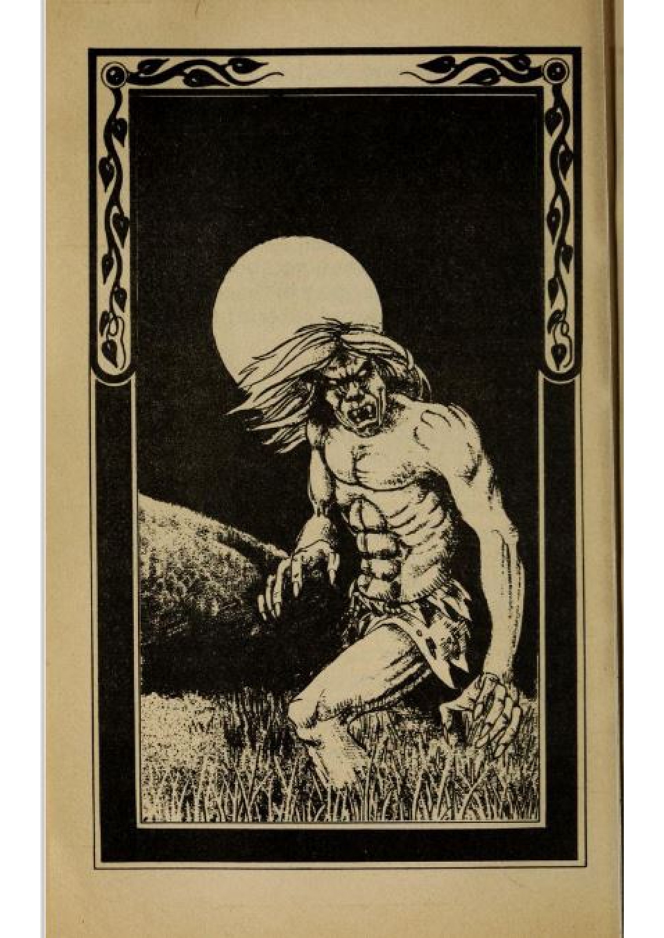 Вы замираете, вглядываясь во тьму. Тебе кажется, или что-то движется к вам в тенях? Да! Ты различаешь смутный силуэт, проворно и целеустремлённо шагающий враскачку сквозь высокую траву. Он выходит на освещённый луной участок, и у тебя перехватывает дыхание от ужаса. Он в чём-то похож на человека, но больше напоминает скелет, плотно обтянутый кожей. Одет он в изодранные, гнилые тряпки. Длинные жгуты белых волос свисают вокруг измождённого лица, а глаза горят зловещим красным светом!