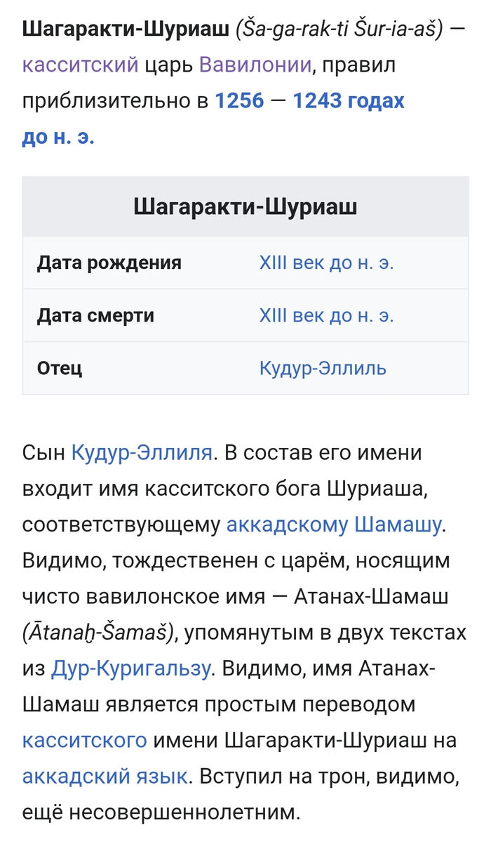 Давайте представим, что имена касситских царей это не эпитет самого царя, приправленный имечком бога-покровителя, а конкретно эпитет и имя самого божества. В таком случае все имена звучат просто и логично. Бурна - Буриаш это Бурна Буря, Нази-Бугаш и Нази-Марутташ это Повелитель (князь) Бог и Повелитель Марут. Караиндаш и Карадуньяш это Гора Инда и Гора Дунья. И наконец Шагаракти Шуриаш это Сгорати (сгорающий) Сурья.
