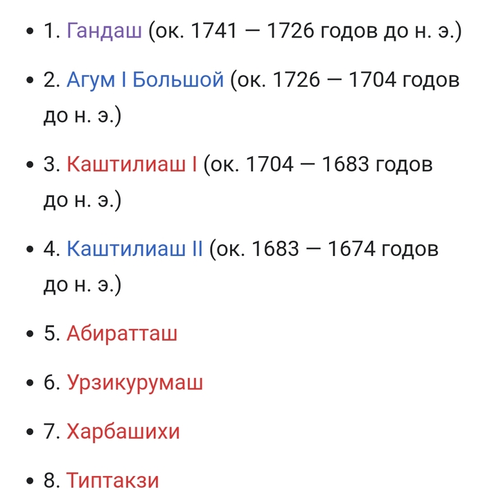 Затем идут малопонятные: Ушши, Абиратташ, Урзикурумаш, Кхарбакхаш, Типтакзи, Атра... После захвата Вавилона: Агум ll Как-Риме (1595-1571 гг. до н.э), затем, после одного-двух неизвестных царей, Бурна-Буриаш l (во второй половине 16го века до н.э.)...