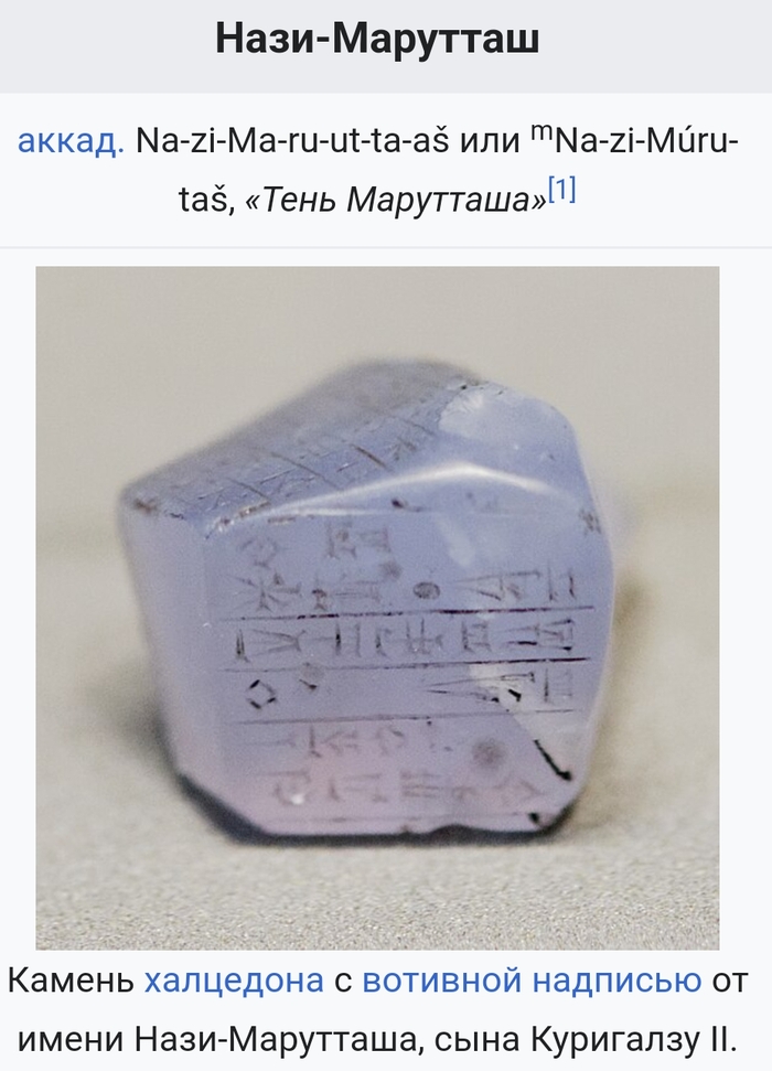 То же касается и имени Нази-Марутташ. Маруты это божественные колесничие в индоевропейской мифологии, но на севере, за редким исключением, они произносились как Марты. Напомню, что марий в арийскую эпоху был пешим воином, а март - колесничим. От этого самого марта произошёл Марс - альбский бог войны, март месяц-воин прогоняющий зиму, Марта (Маруся) - женщина принадлежащая марту (маруту), Мартин (Мартын) - сын марта и т. д. Короче, вы поняли Нази-Марутташ это Князь-Марут, Князь во имя бога-колесниц.