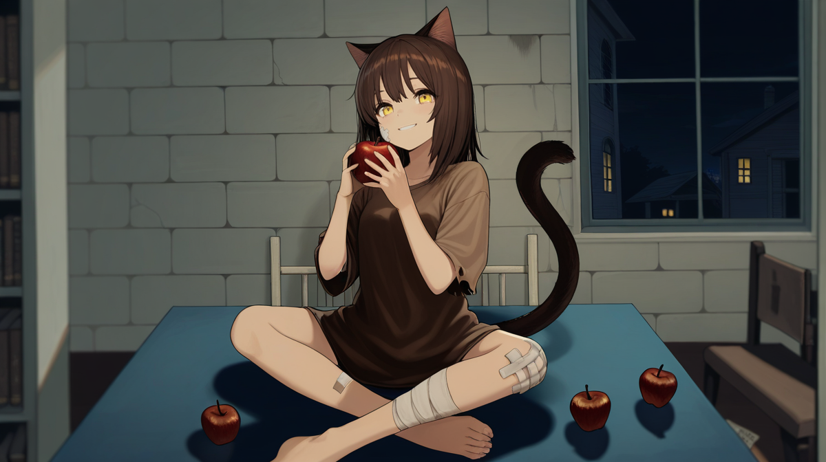 По середине комнаты на стуле сидела девушка-кошка, чуть покачиваясь из стороны в сторону держа в руках одну из украденных у меня книг. Совершенно спокойно она достала откуда-то яблоко и не обращая на меня внимания начала свою трапезу.